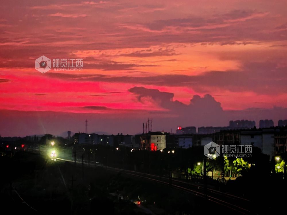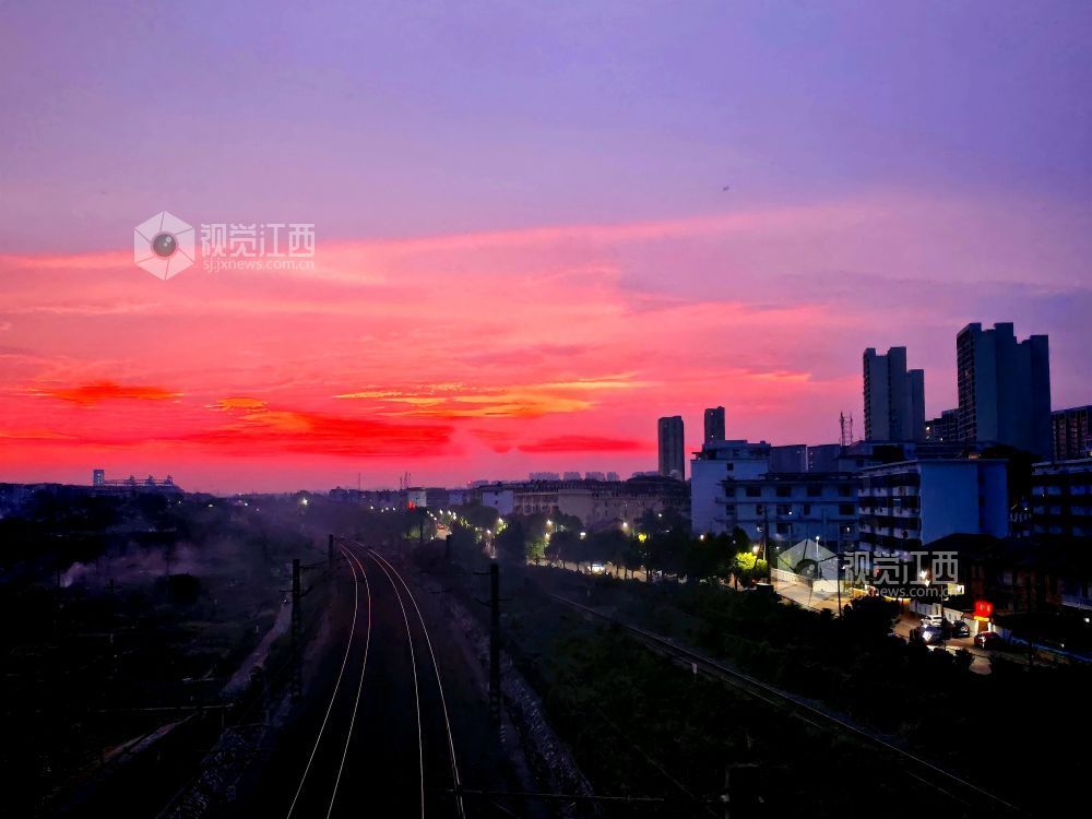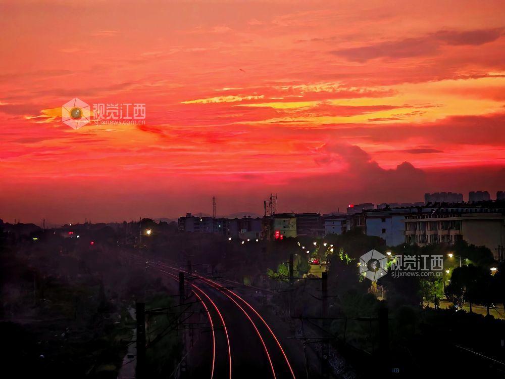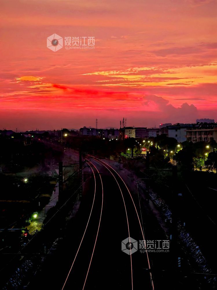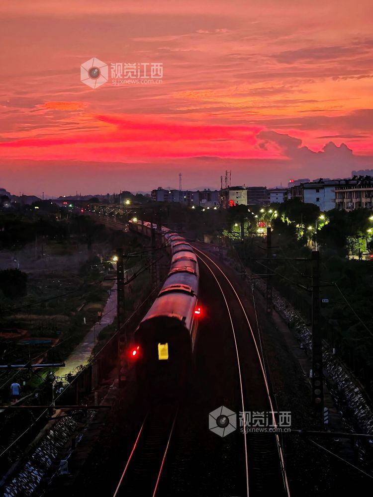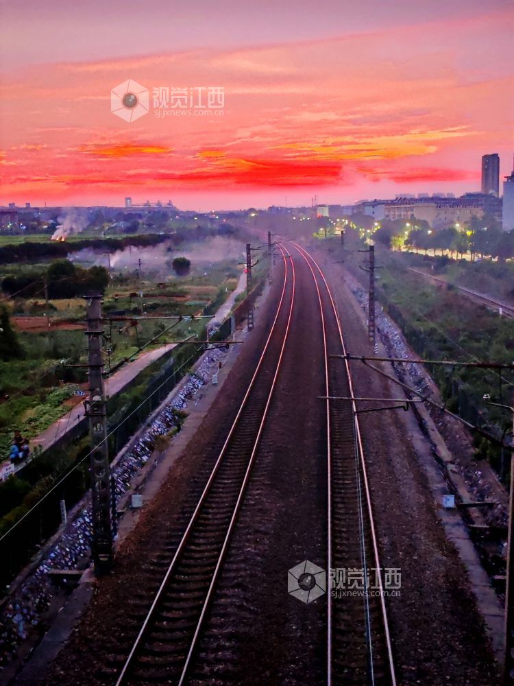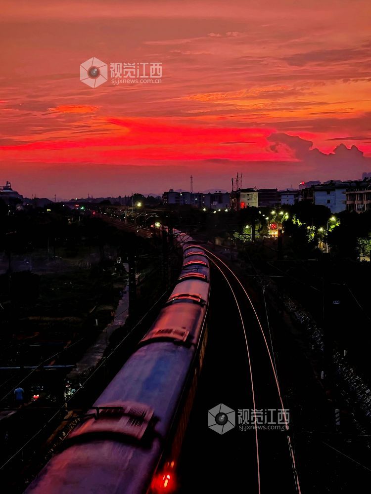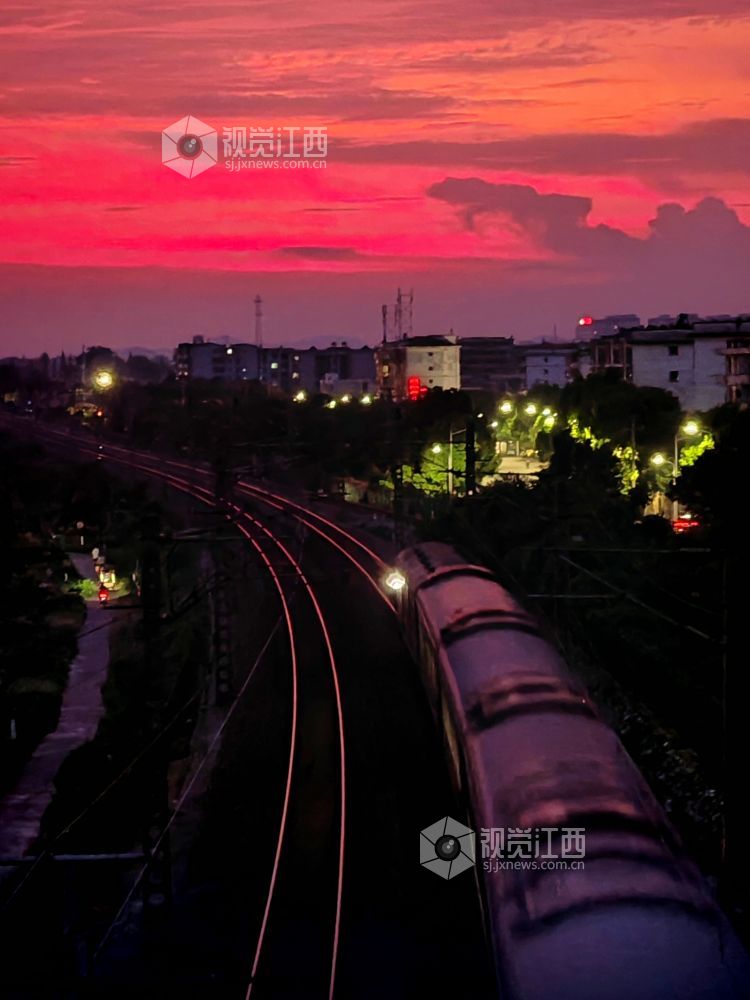 2025年9月4日傍晚,江西省分宜县火车站立交桥下,一列火车在落日余晖中驶过蜿蜒的铁轨。铁轨反射着金色光芒,与初上的城市灯火交相辉映。西天的云彩被夕阳染成橘红、绛紫与鎏金交织的锦缎,两条平行铁轨在余晖中泛着柔和而明亮的金属光泽,犹如通往暮色深处的金色甬道,为这座小城勾勒出一道别致的风景。