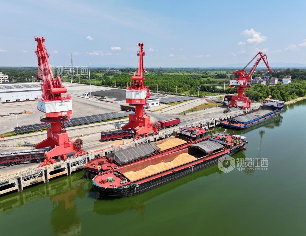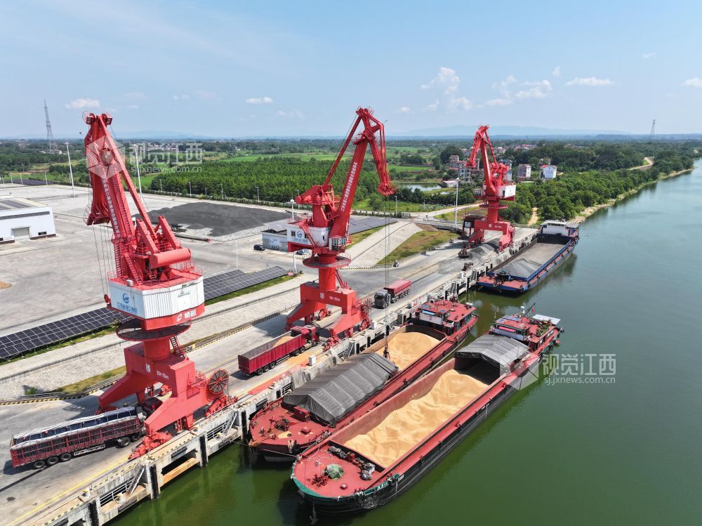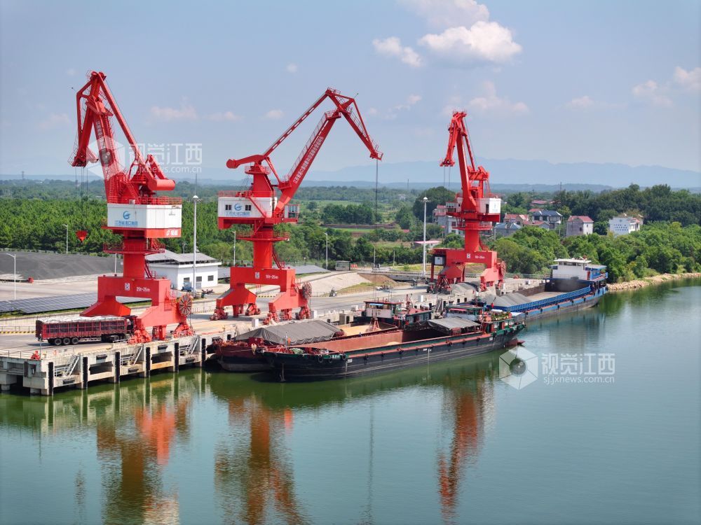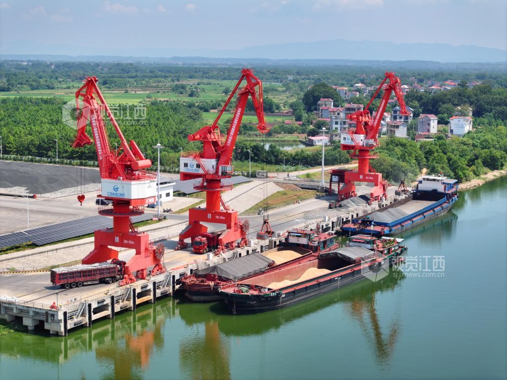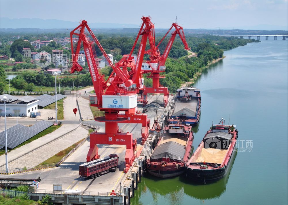9月6日,江西省港口集团泰和沿溪综合货运码头起重机正在装卸货物作业。