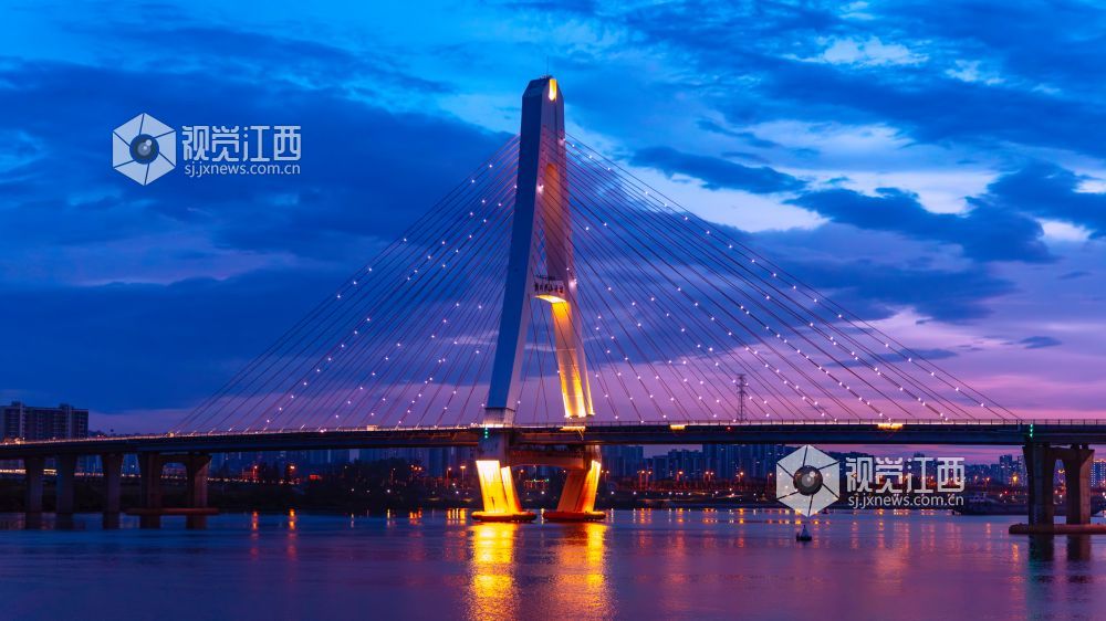 2025年9月9日傍晚,拍摄于江西省吉安市新井冈山大桥。夜幕下的新井冈山大桥,宛如一条巨龙横跨赣江,桥面灯光闪烁,与晚霞相映成趣。