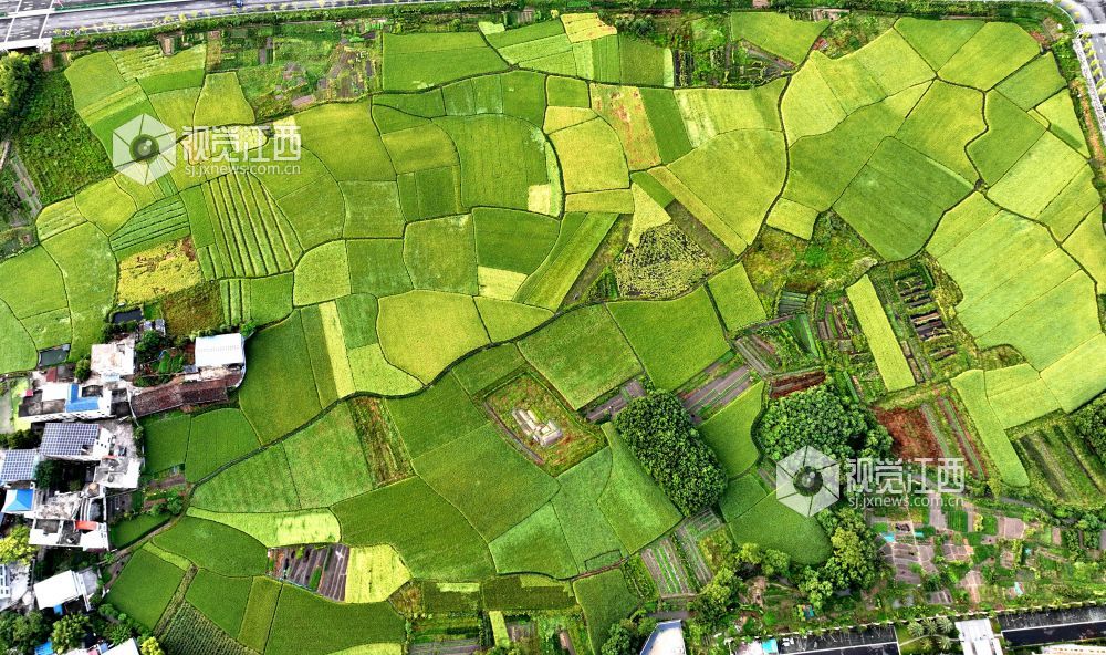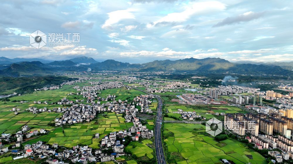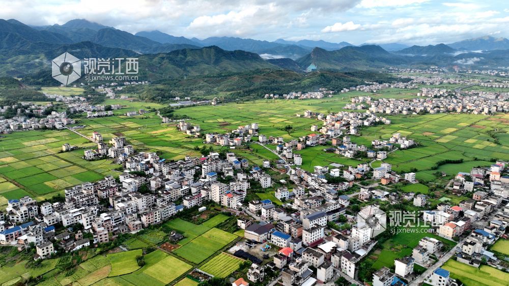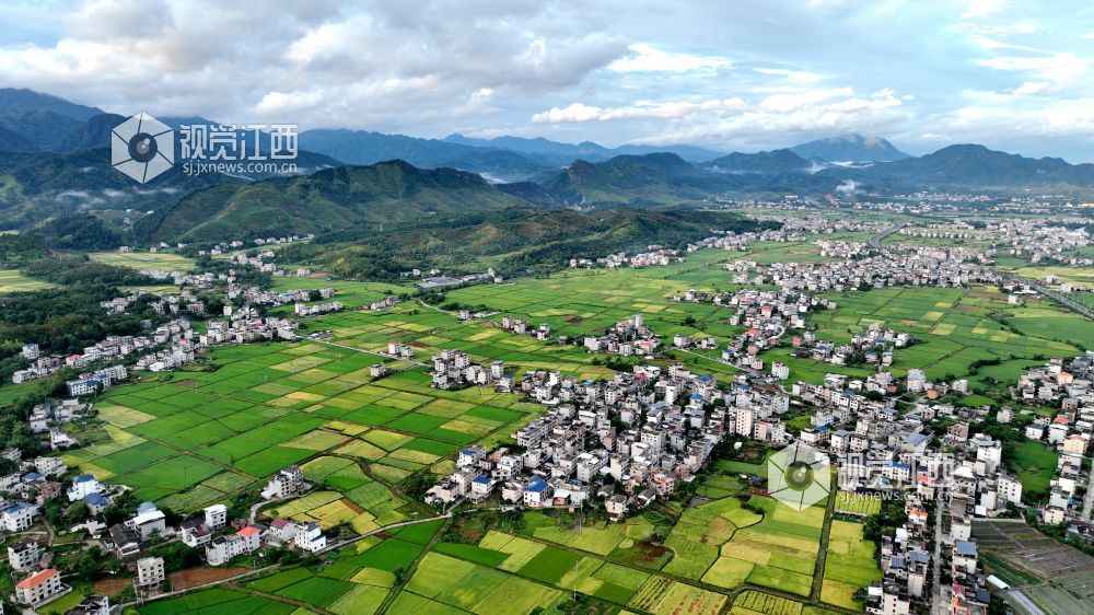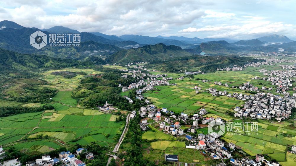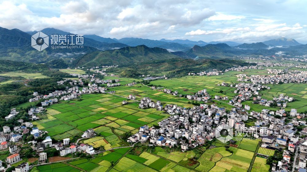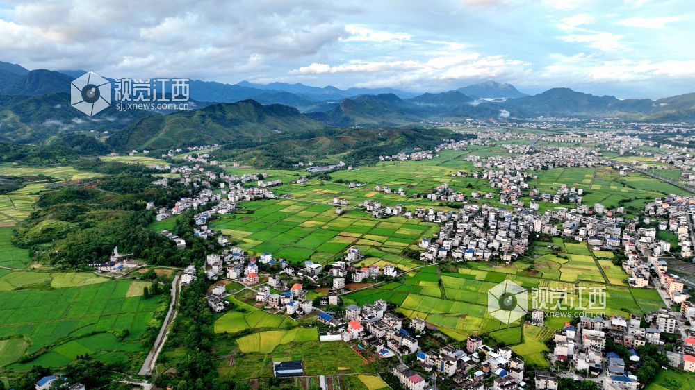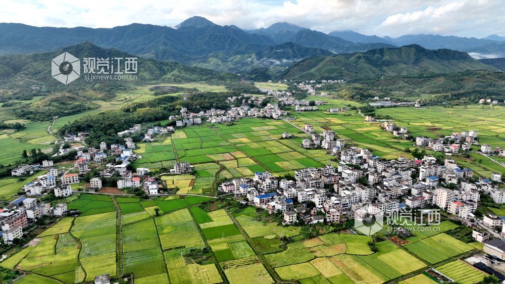 2025年9月10日,江西省遂川县航拍镜头下的泉江镇乡村,绿意盎然的稻田与错落有致的民居相互映衬,远处山峦层叠,云雾缭绕。