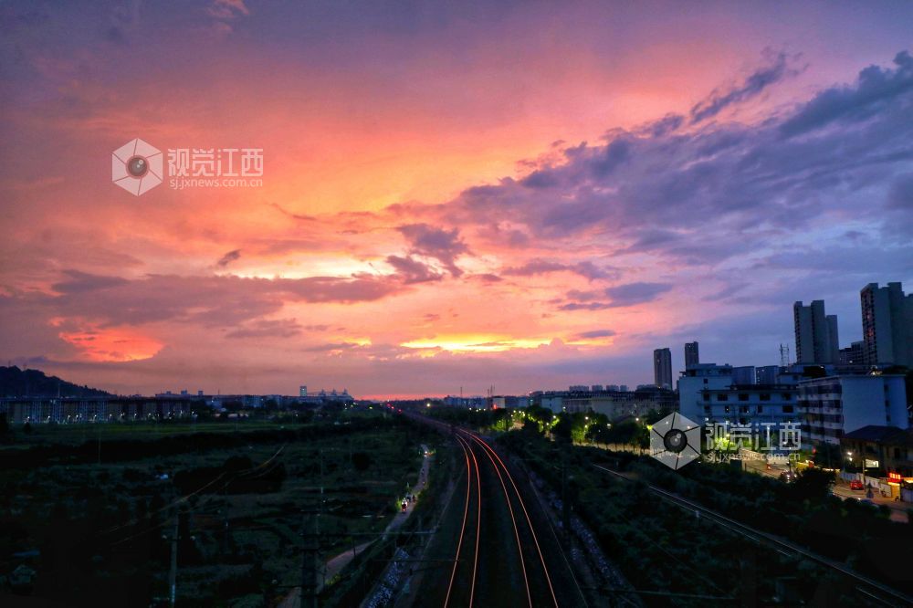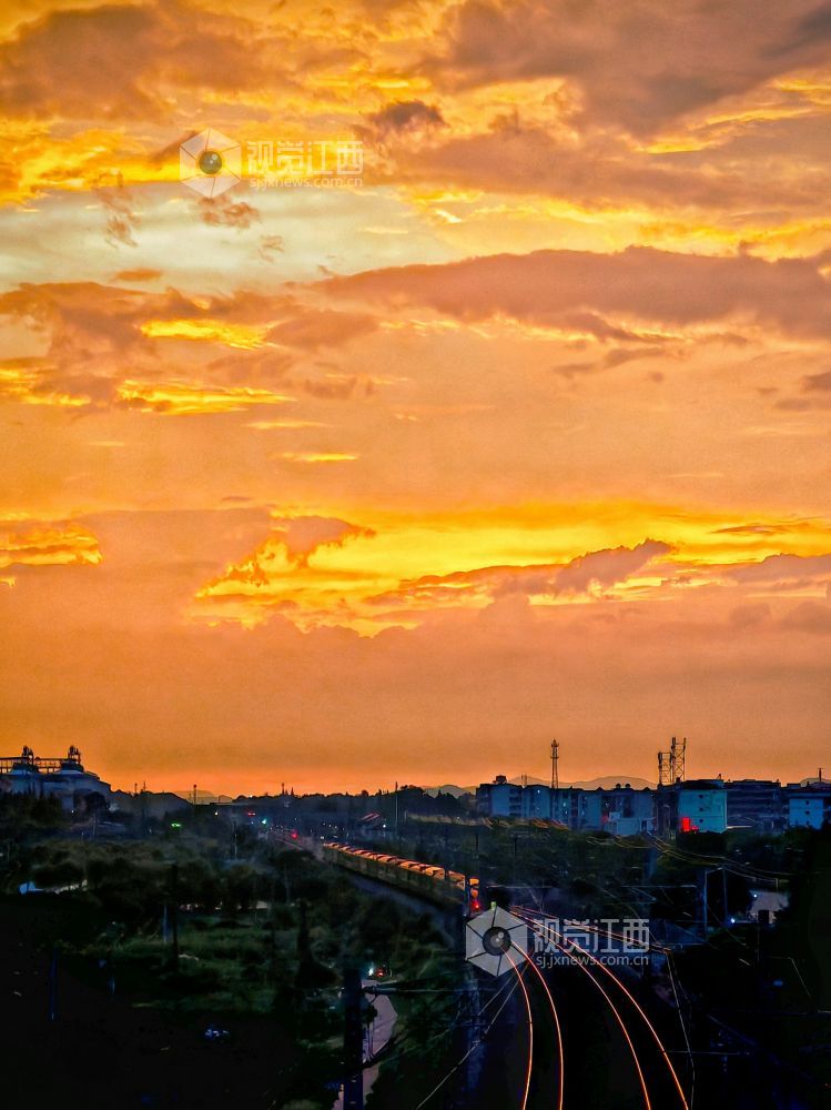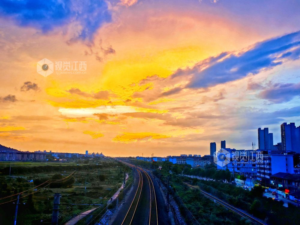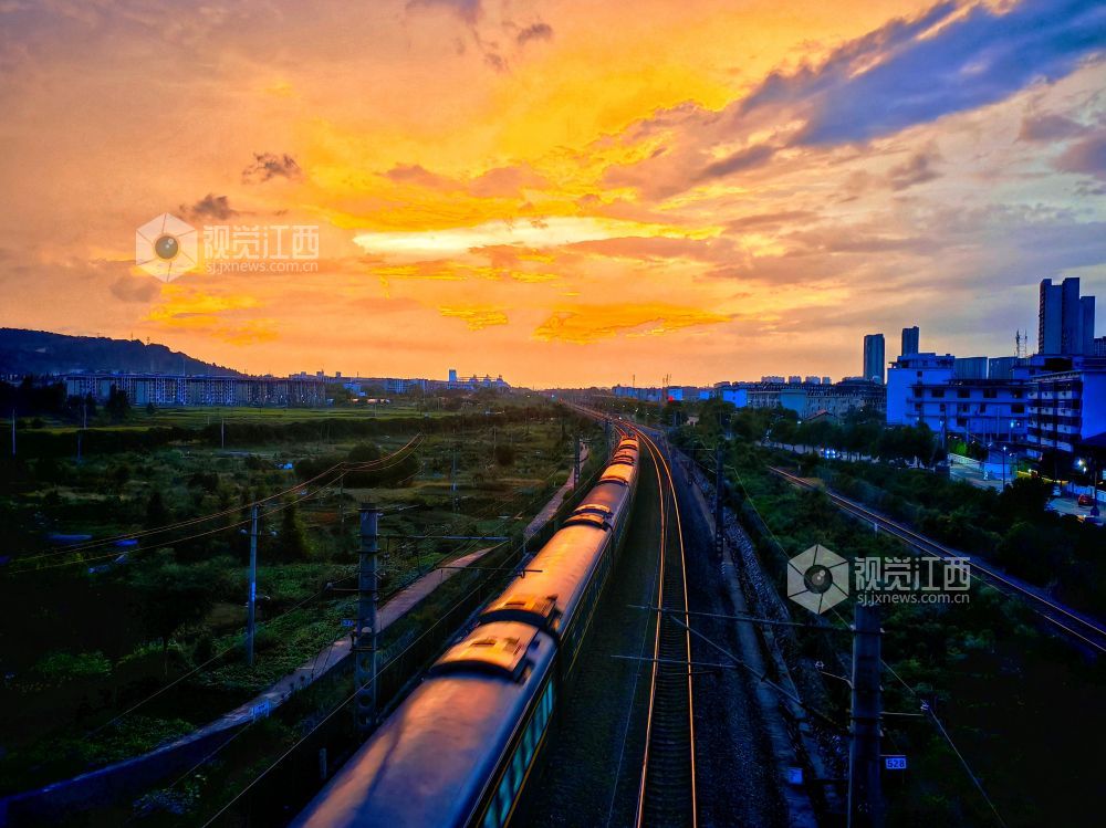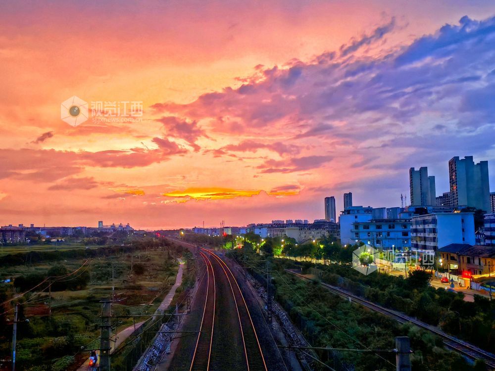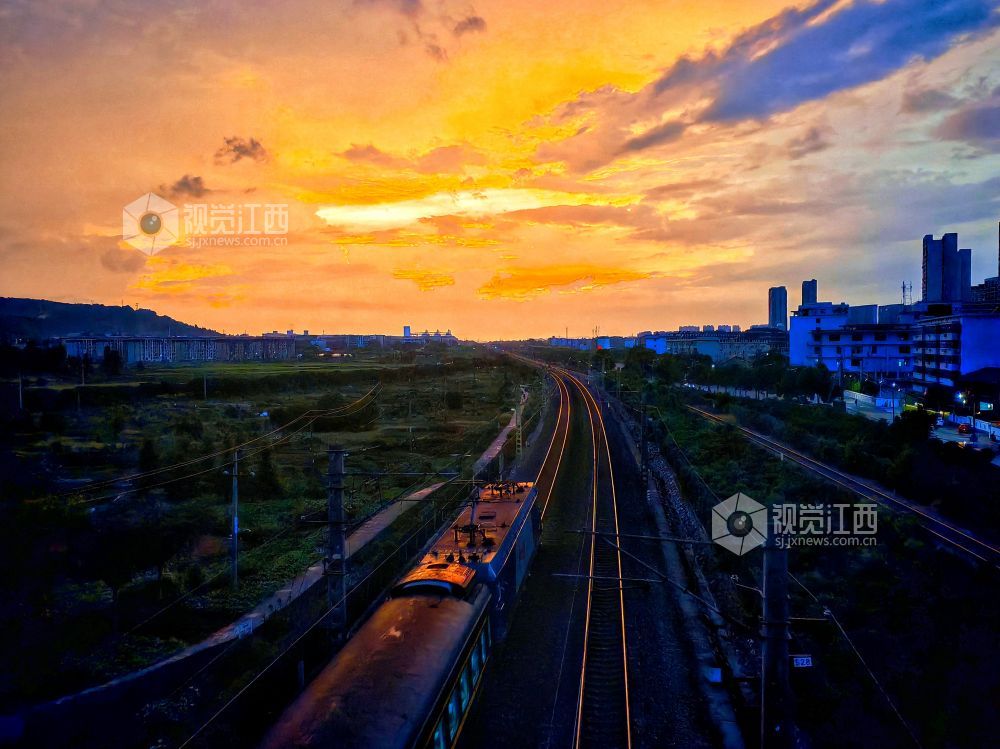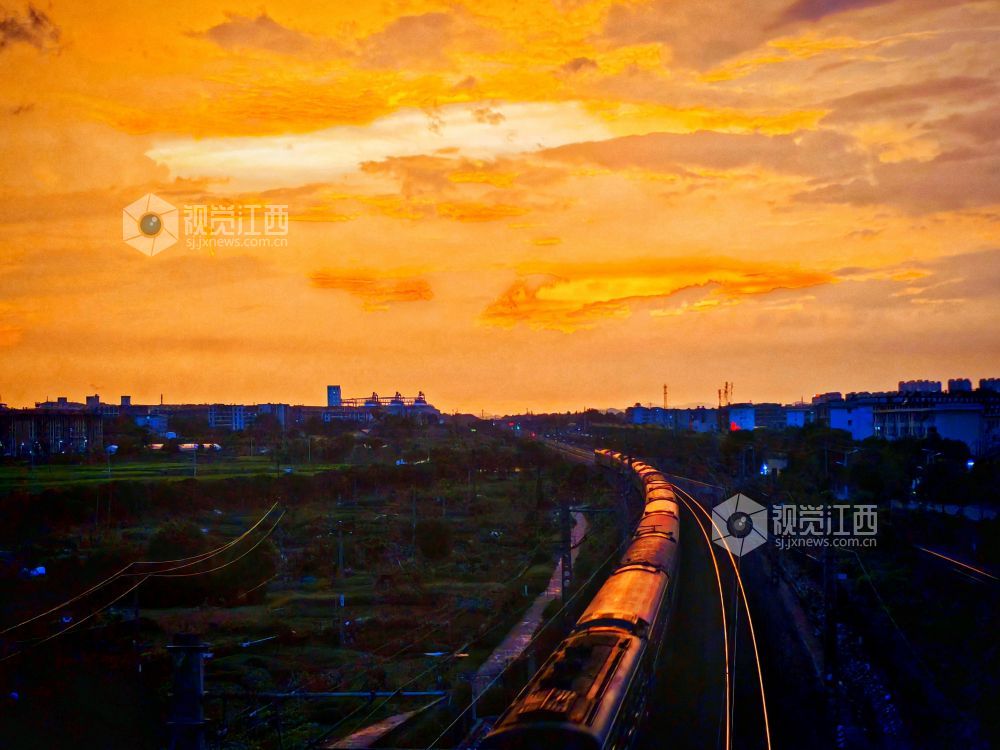 2025年9月10日傍晚,夕阳余晖洒向江西省分宜县城郊的火车铁轨。落日熔金与两条平行铁轨交相辉映,仿佛为铁轨披上了一件锦衣,日落的光芒在行驶的火车上跳跃,犹如灵动的音符,为小城奏响一曲华美乐章。