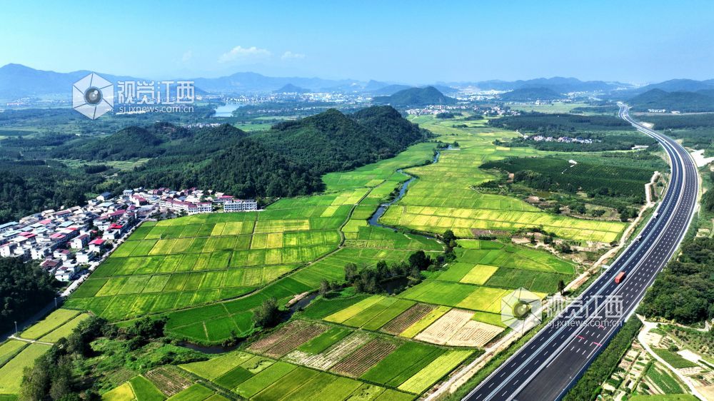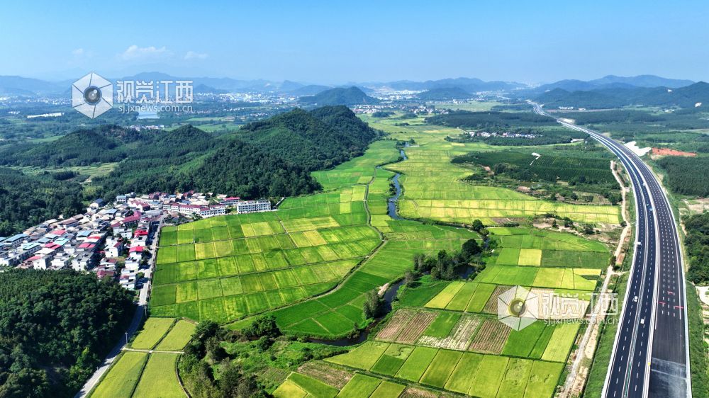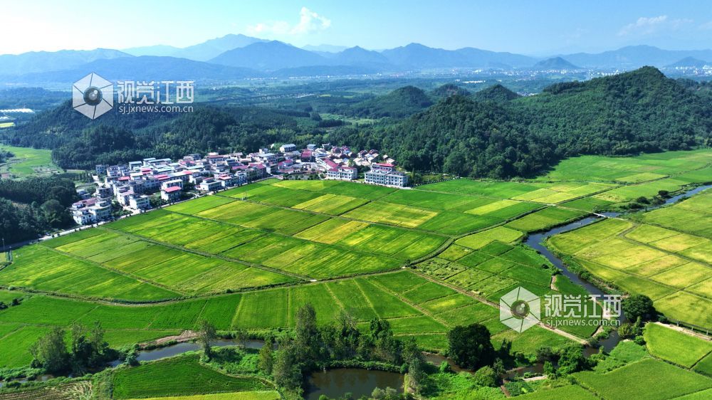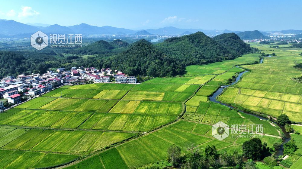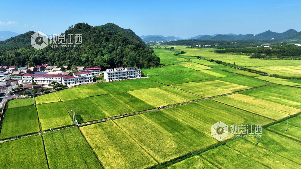 2025年9月16日,江西省分宜县凤阳镇西廊村的中稻陆续成熟。俯瞰田园,大小田块无规则分布,黄绿相间,与乡村农舍、蓝天白云相互点缀,犹如一幅风景油画。