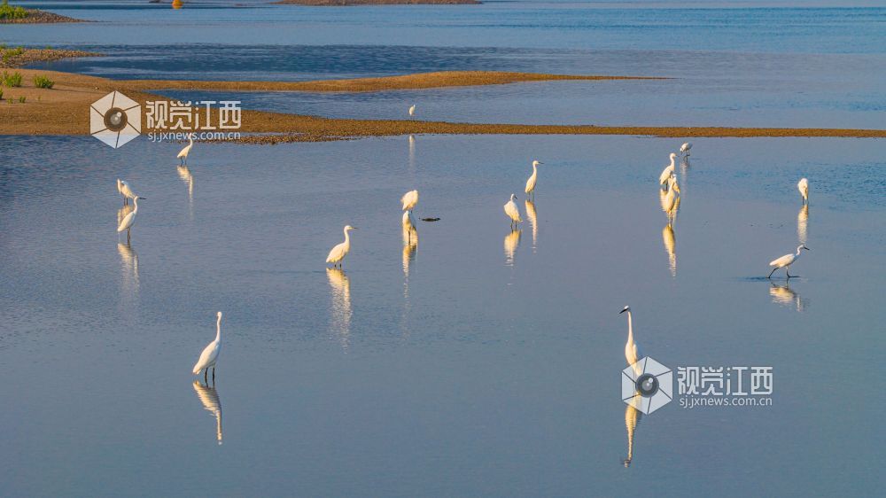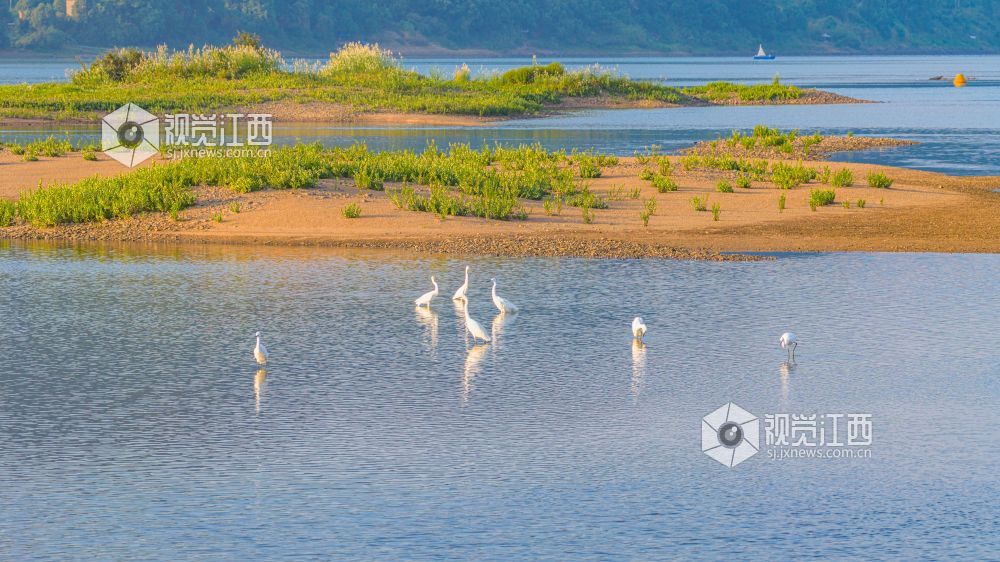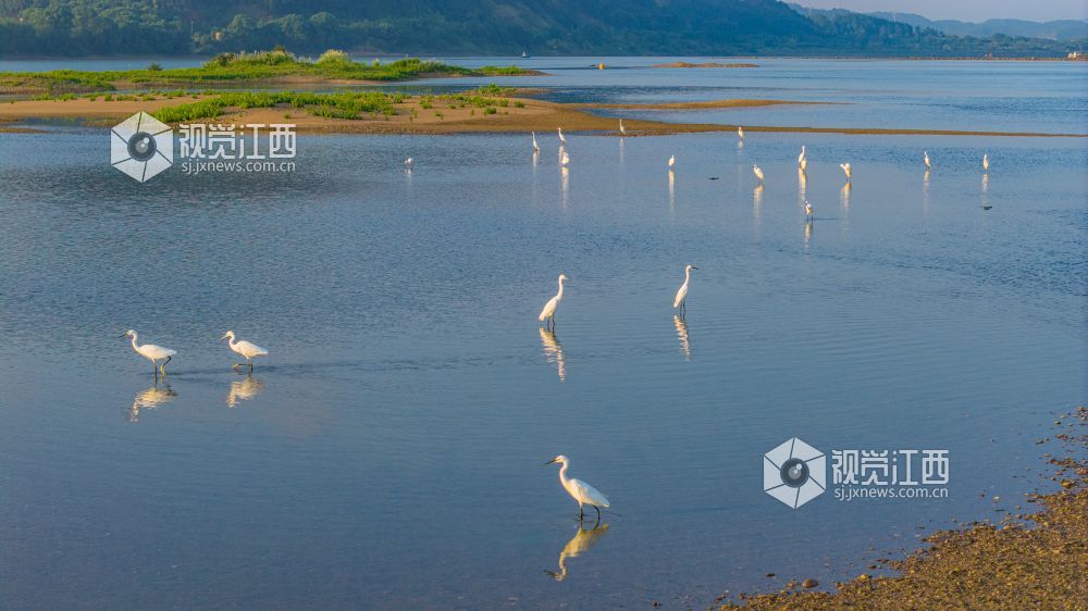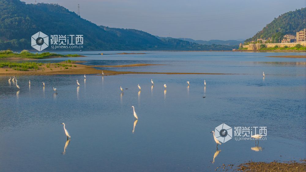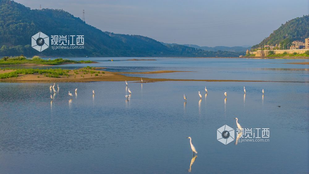 9月14日,在江西省吉安市峡江县巴邱镇赣江水域,白鹭或飞或栖,与山水民居相映成趣。当地生态环境的持续改善,使这里成为白鹭的乐园,尽显人与自然的和谐之美。