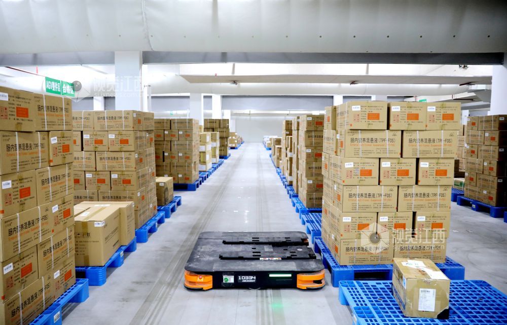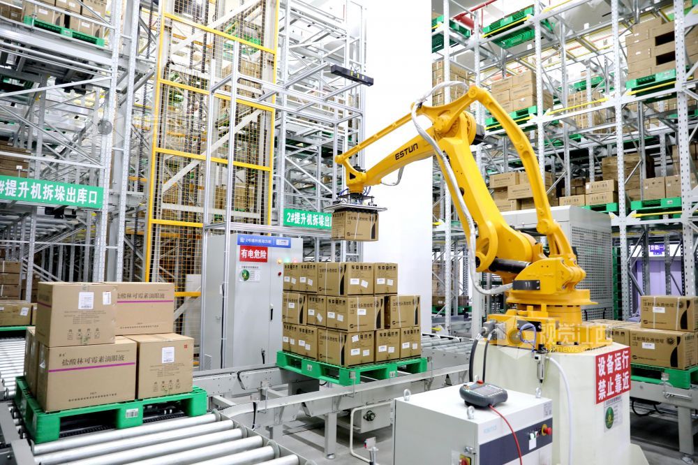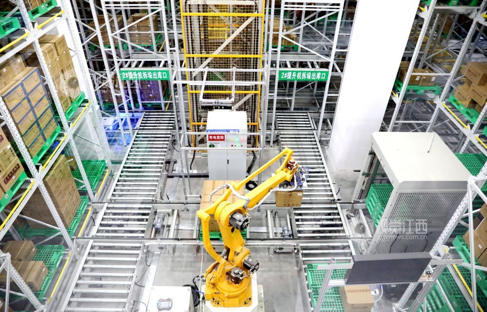 2025年9月19日,江西省吉安市峡江县赣中现代物流园智慧冷链仓储中心,码垛机器人在分拣货物。