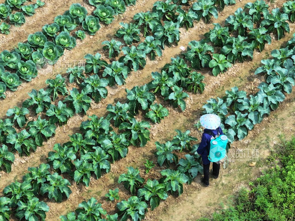 9月19日,江西省吉安市泰和县澄江镇南门村,农民正在管护蔬菜。江西泰和县积极抓好秋冬蔬菜生产工作,引导农民开展蔬菜田间管护,进行病虫防治,加强水肥管理,确保秋冬季蔬菜市场供应。