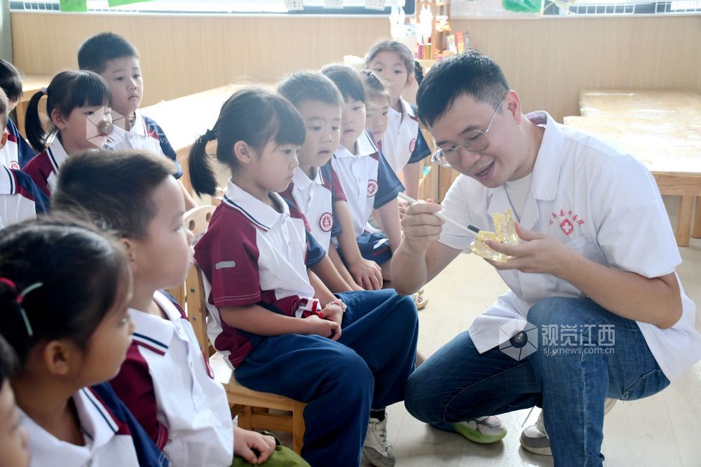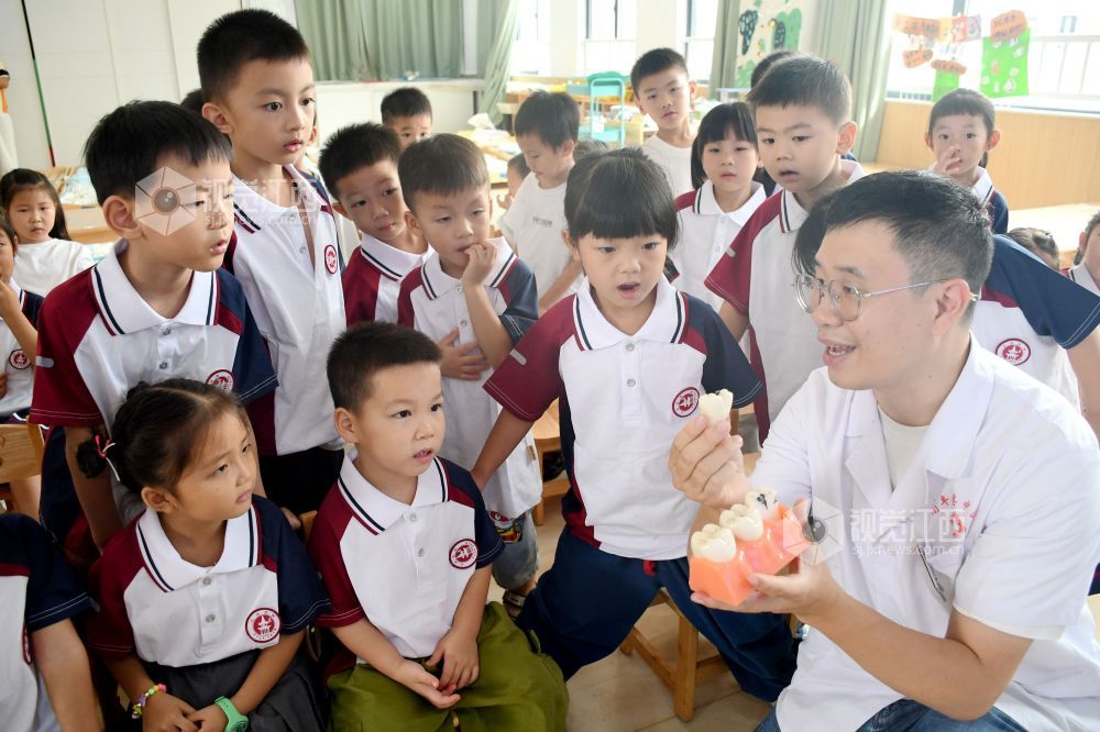 2025年9月19日下午,在江西省抚州市南丰县第三幼儿园,该县中医院口腔科医生在为幼儿讲解口腔卫生知识,旨在培养幼儿良好的口腔卫生习惯。