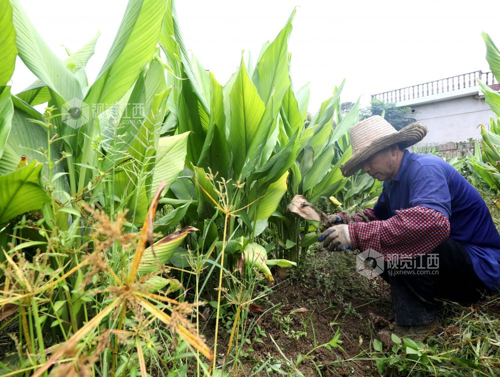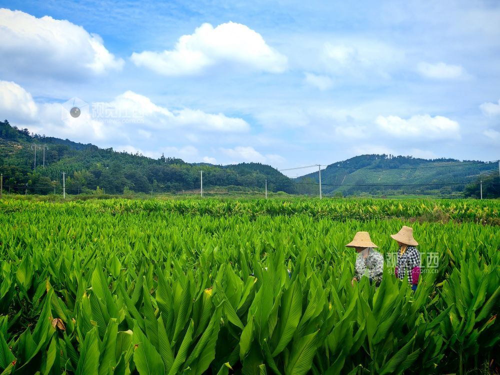 2025年9月23日,江西省分宜县凤阳镇郭家村姜黄药材种植基地,村民在技术人员的指导下,锄草、扯病株,一派忙碌景象。