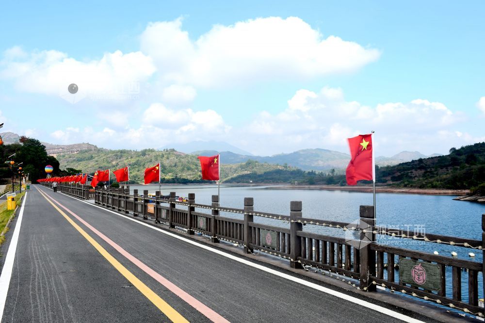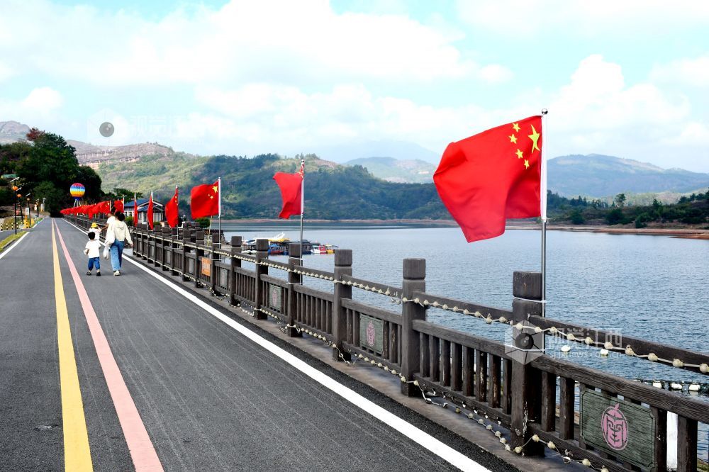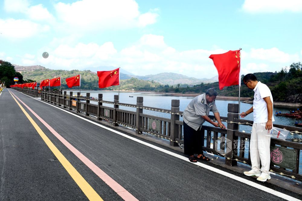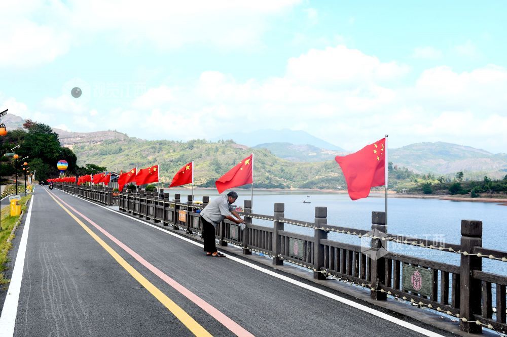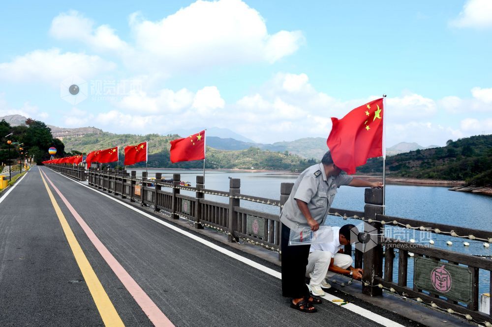 2025年9月27日,江西省抚州市南丰县蜜橘湖景区蜜橘湖堤坝上,工作人员在悬挂国旗,鲜艳的五星红旗迎风飘扬,营造中秋、国庆期间喜庆祥和的节日氛围。