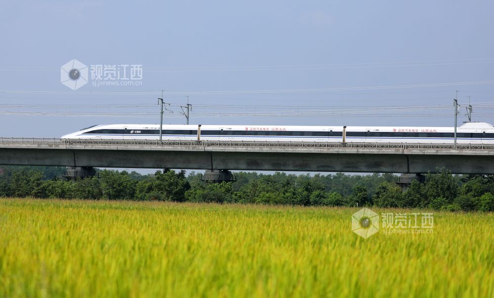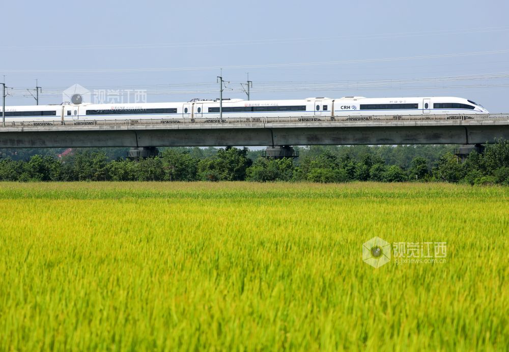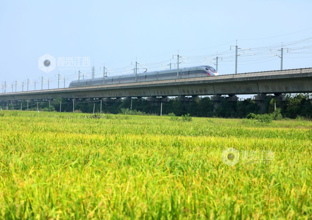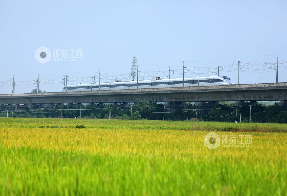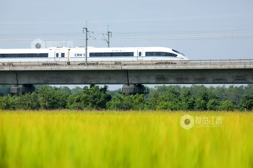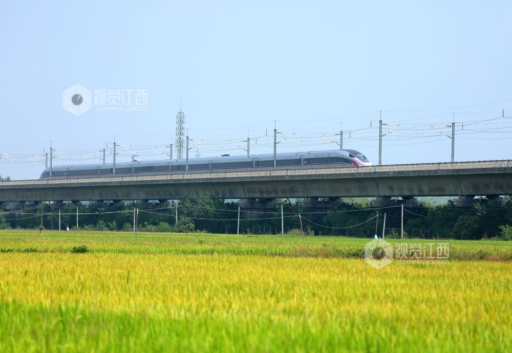 9月30日,一列动车从江西泰和高铁站开出,飞驰在昌赣高铁泰和赣江特大桥上。江西泰和县积极做好国庆中秋假期交通运输管理工作,科学调度运力资源,优化服务保障,确保假期旅客平安有序出行。