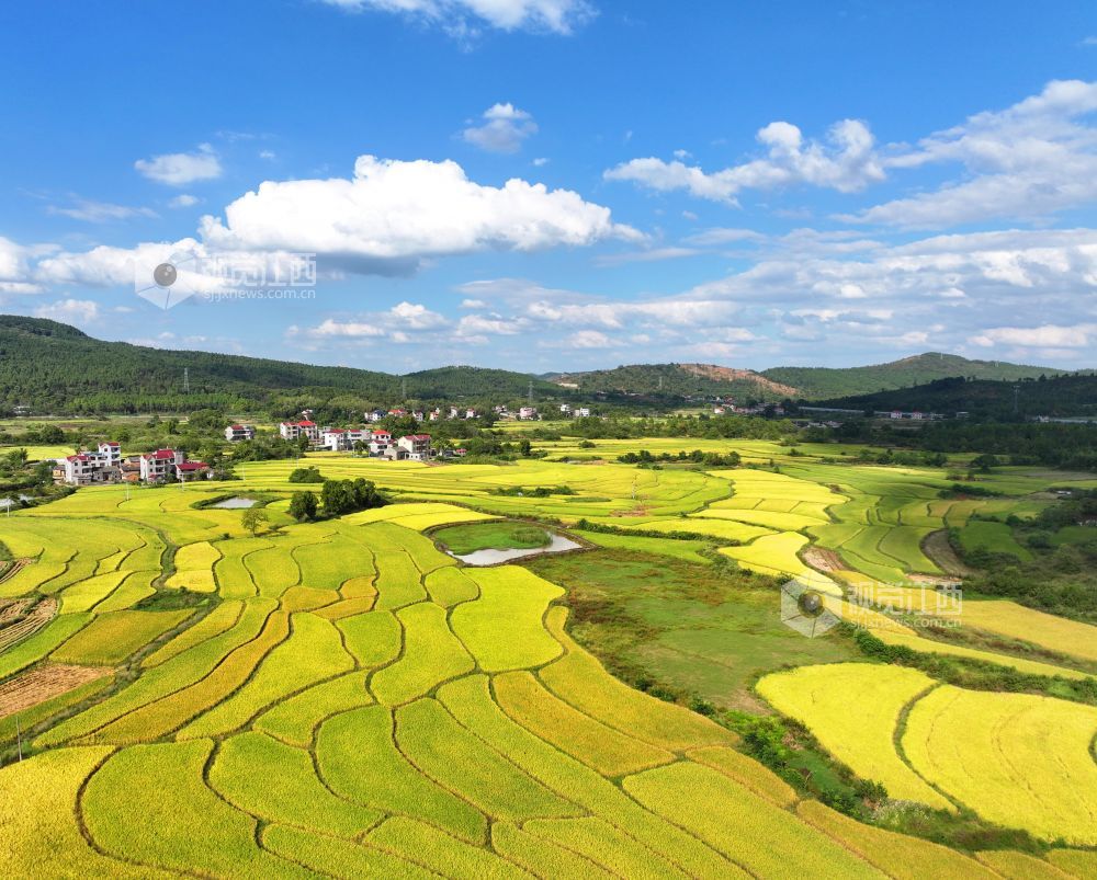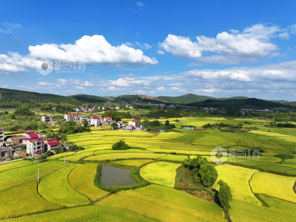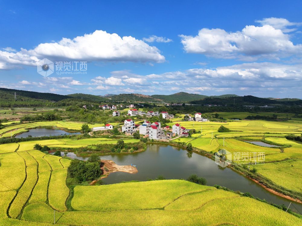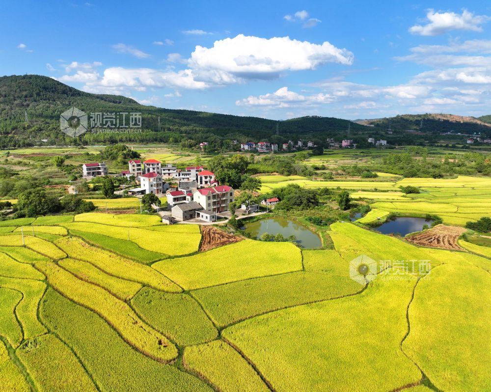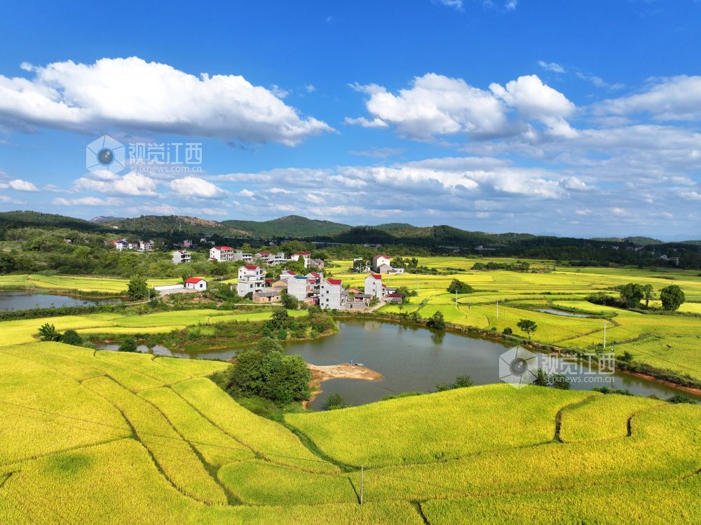 10月5日,江西省吉安市泰和县马市镇汉溪村水稻种植区,金色大地与蓝天白云、红瓦农房相映成景,秋日田园“丰”景如画。江西泰和县水稻陆续泛黄成熟,田园铺满金色,呈现一派丰收景象。