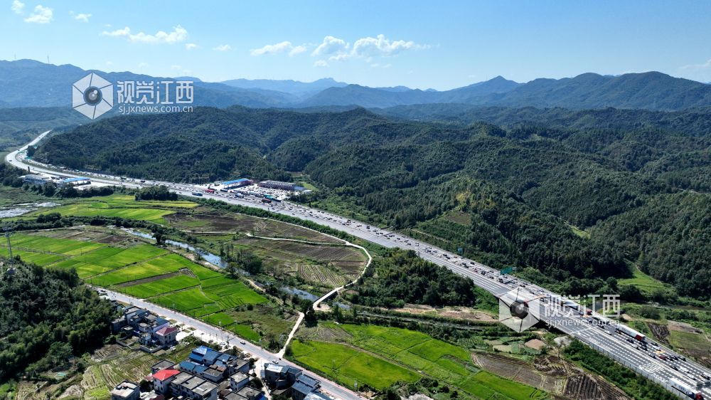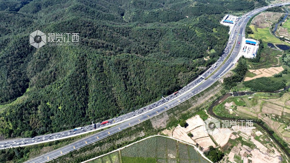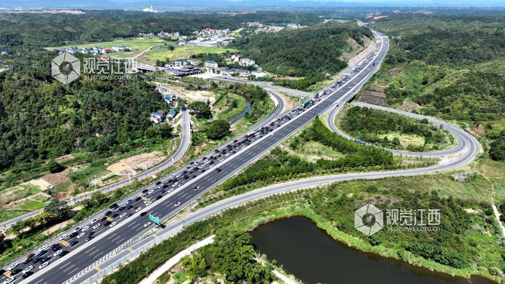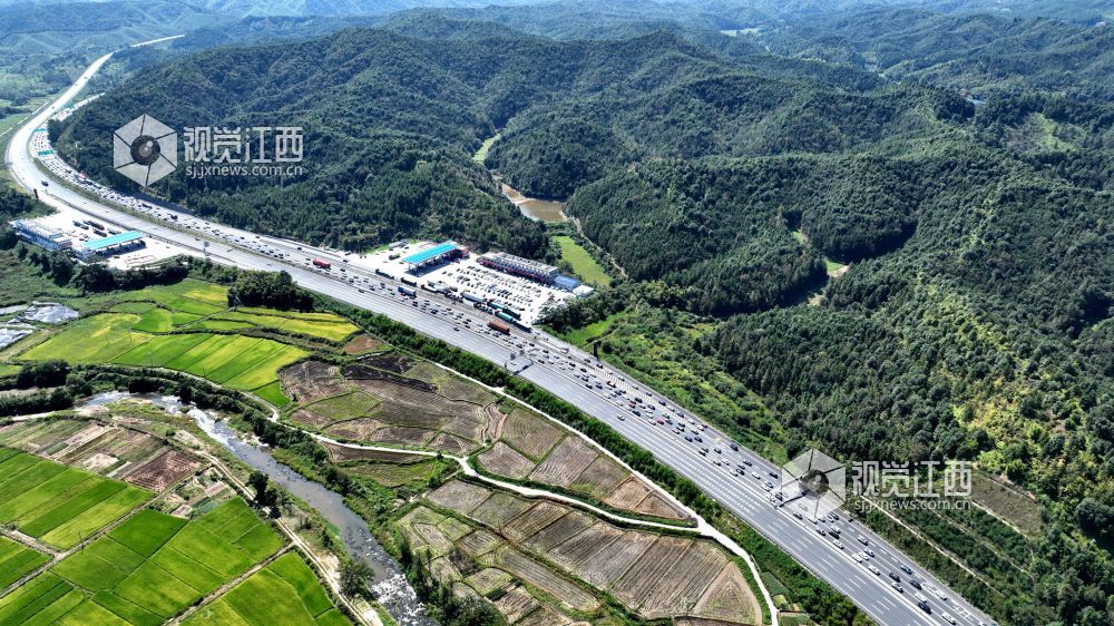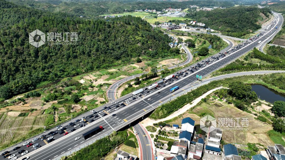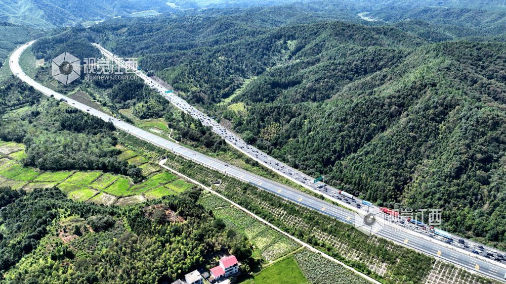 10月7日,双节假期进入尾声,大广高速江西遂川县段迎来南下返程高峰。航拍镜头下,高速公路上车流如长龙般蜿蜒向前,与周边翠绿山林、错落有致的田野村落相映成趣。