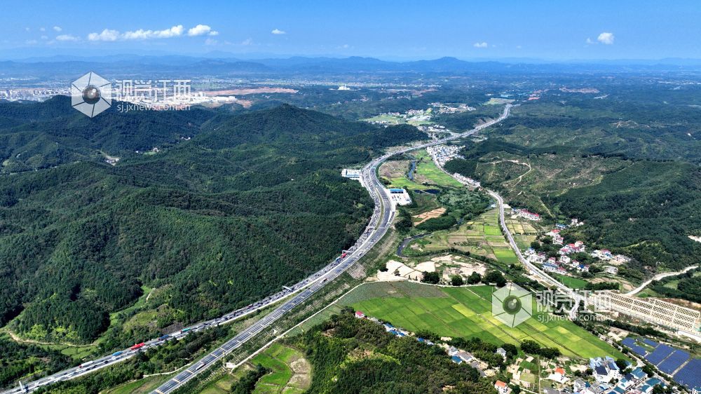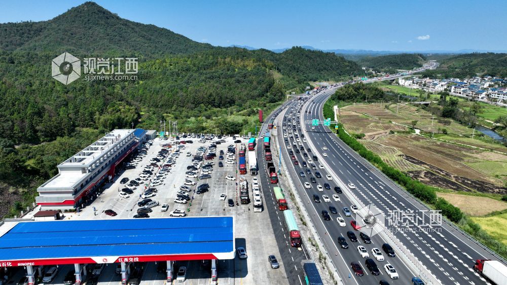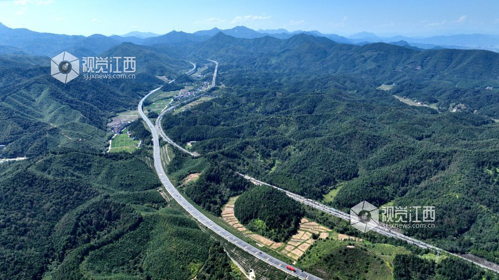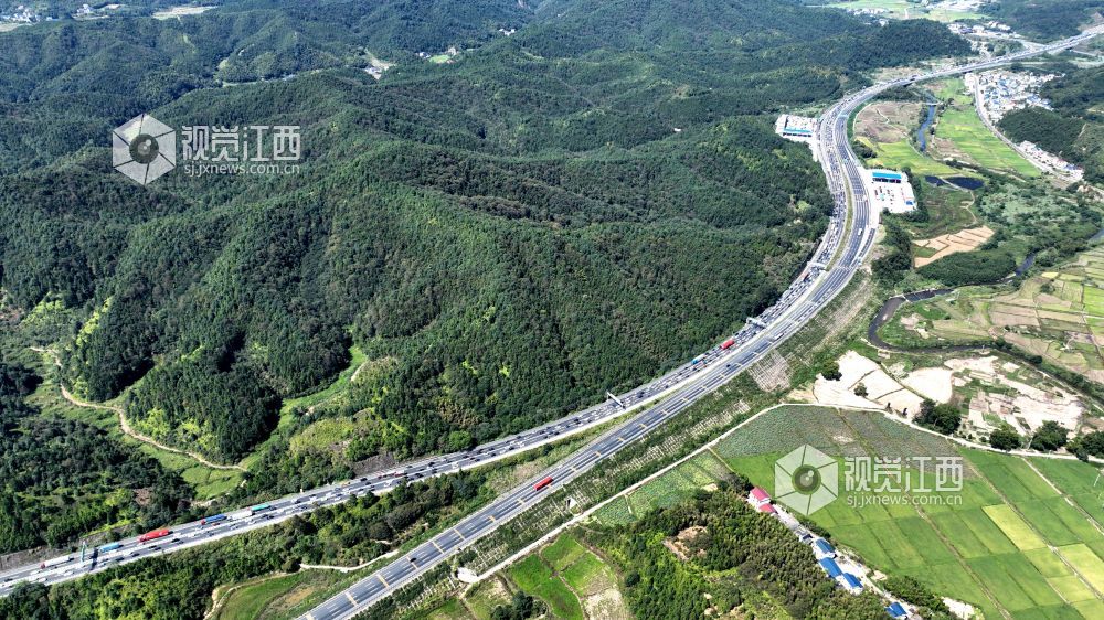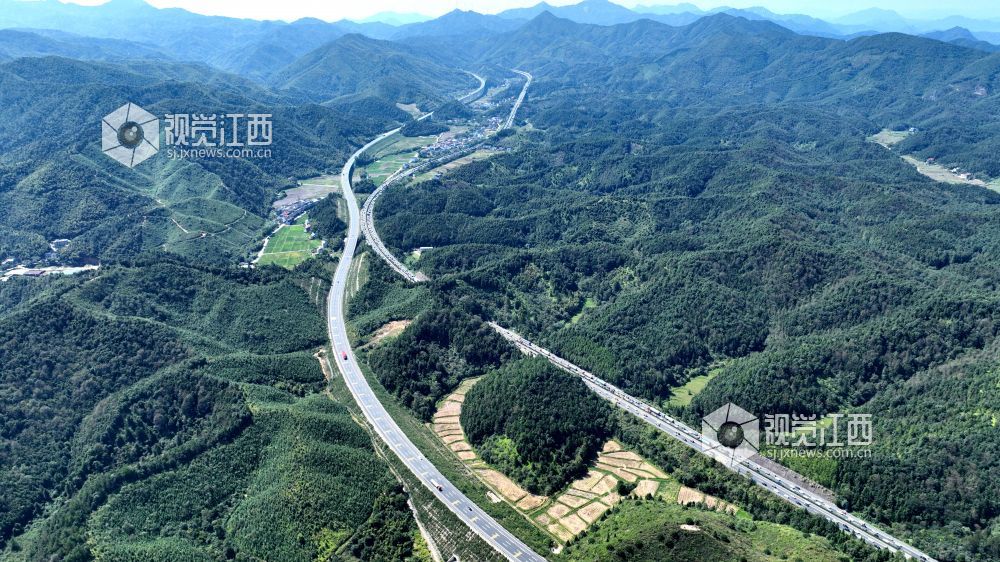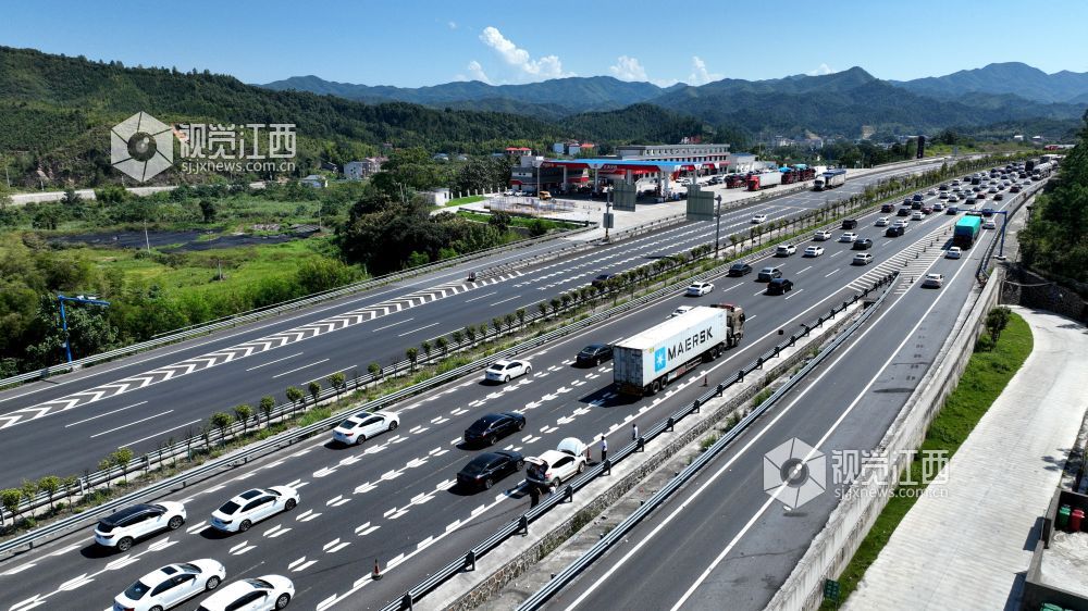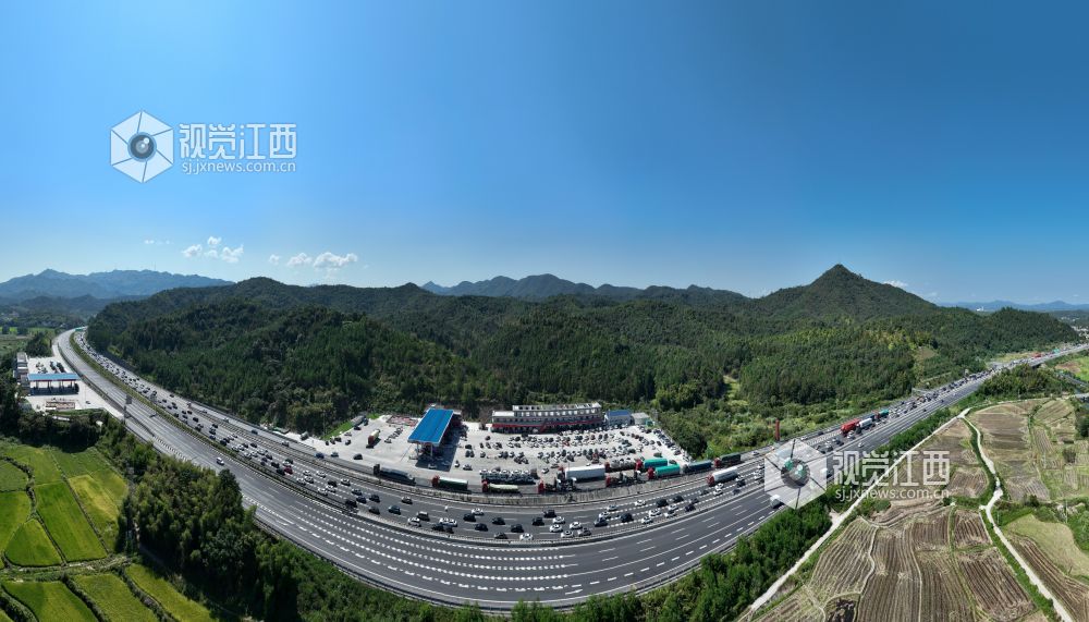 10月7日,双节假期进入尾声,大广高速江西遂川县段迎来南下返程高峰。航拍镜头下,高速公路上车流如长龙般蜿蜒向前,与周边翠绿山林、错落有致的田野村落相映成趣。