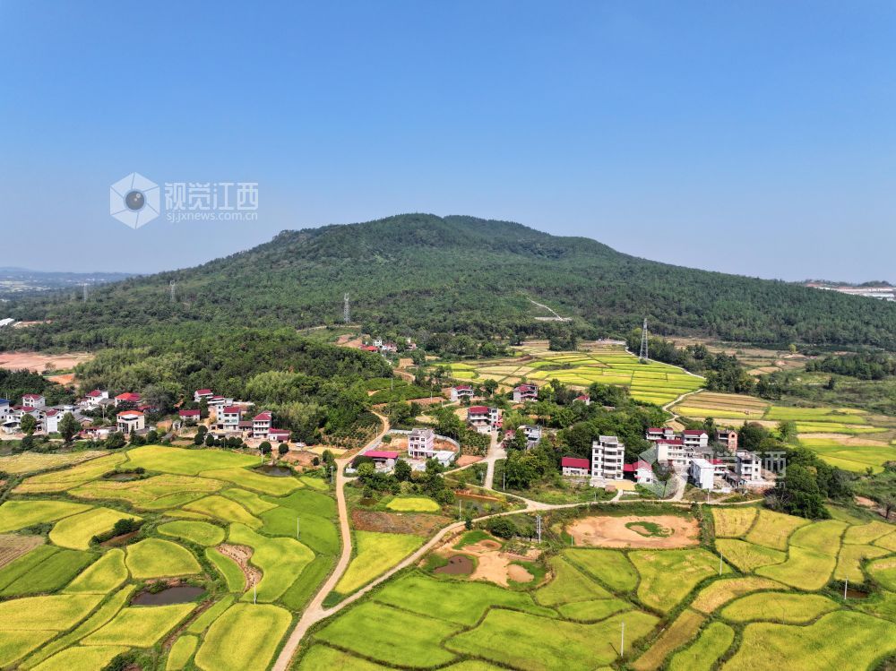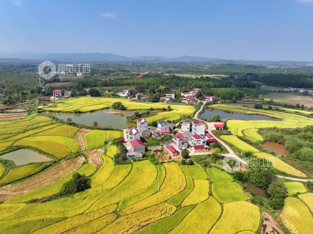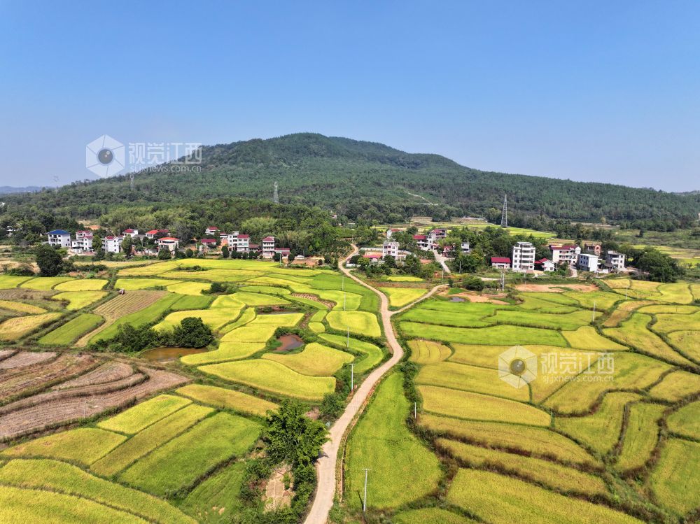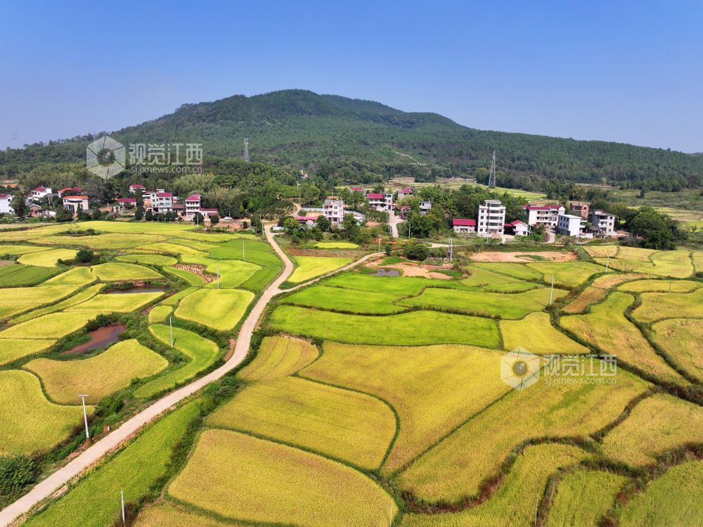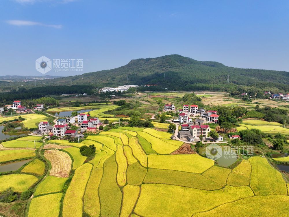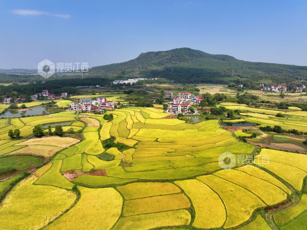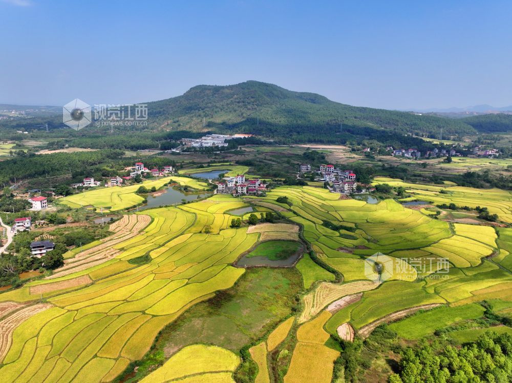 10月8日,江西省吉安市泰和县马市镇武山脚下,沃野之上水稻金黄,田园呈现一派丰收的美丽景象。