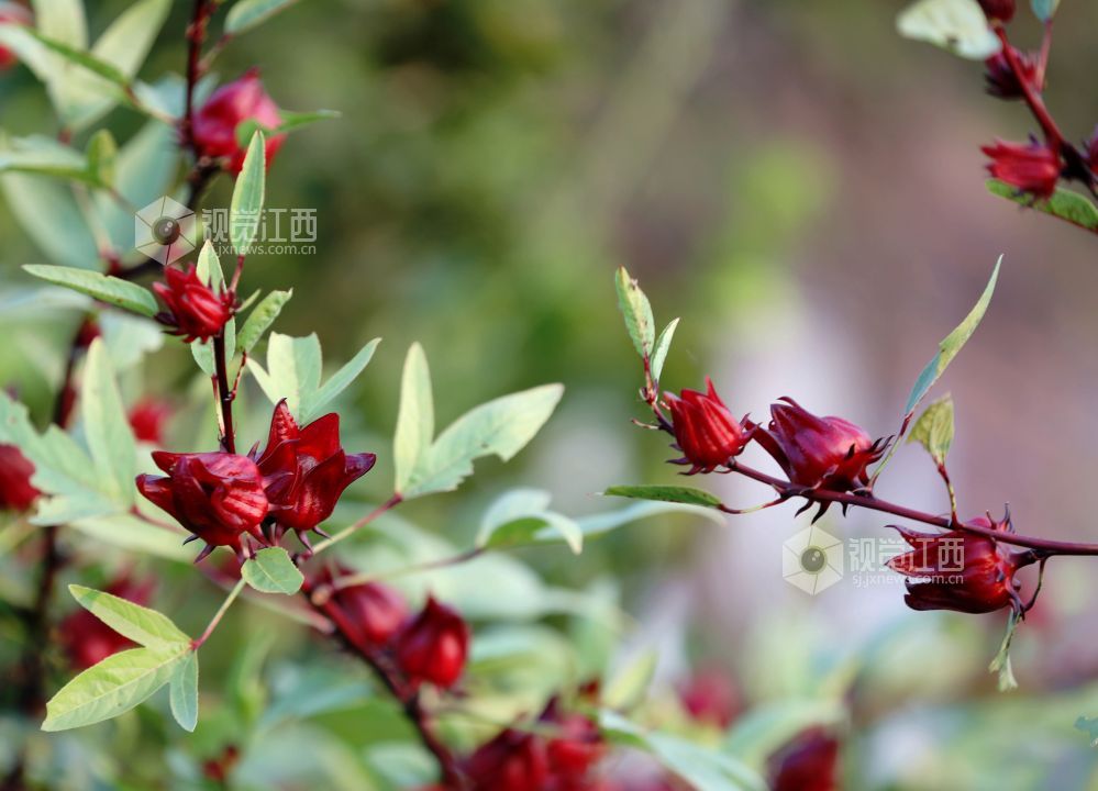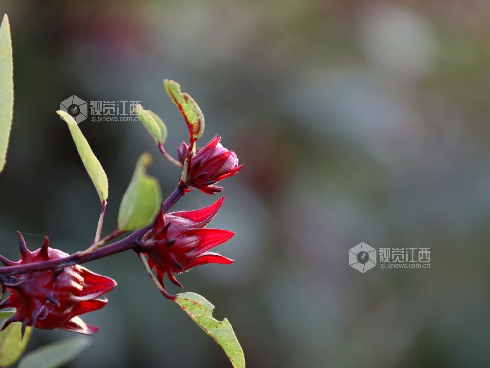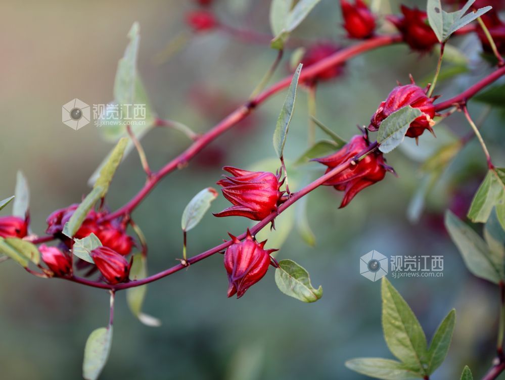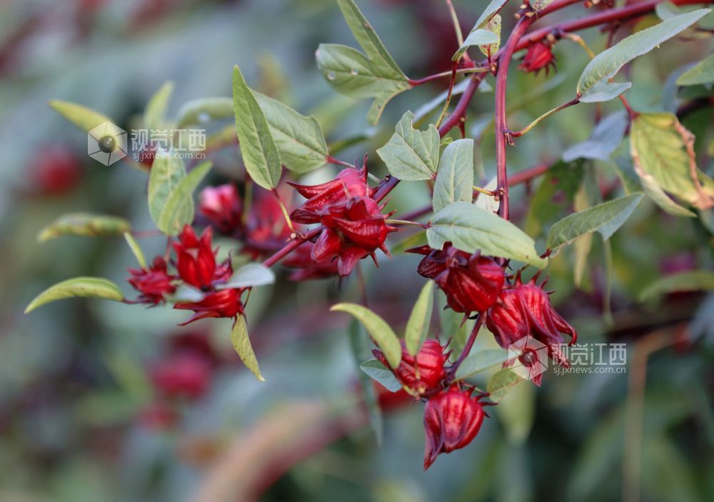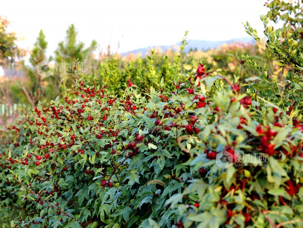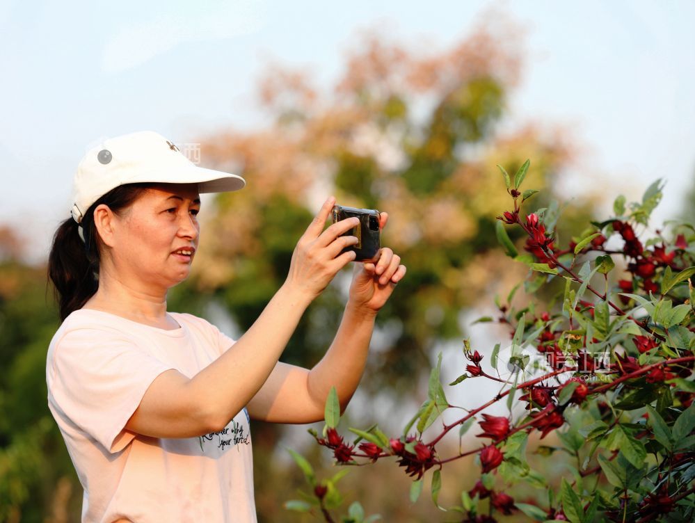 2025年10月12日,江西省分宜县分宜镇角元村洛神花种植园,游客在赏花拍照。金秋十月,分宜镇角元村种植的洛神花迎来丰收季。连片的洛神花植株上,红艳饱满的花萼层层叠叠,宛如一团燃烧的火焰,在秋日阳光下熠熠生辉,构成一幅美丽的田园画卷。被誉为“植物红宝石”的洛神花,不仅观赏性强,还具有很高的营养和药用价值,也是当地村民增收的“致富花”。