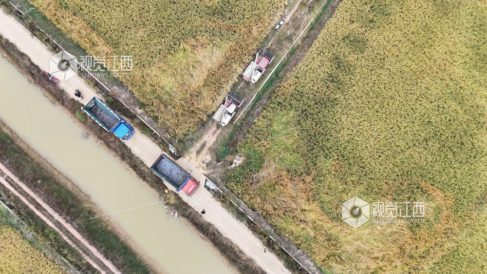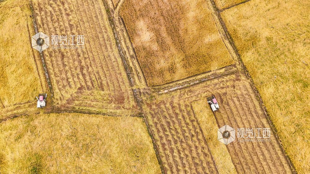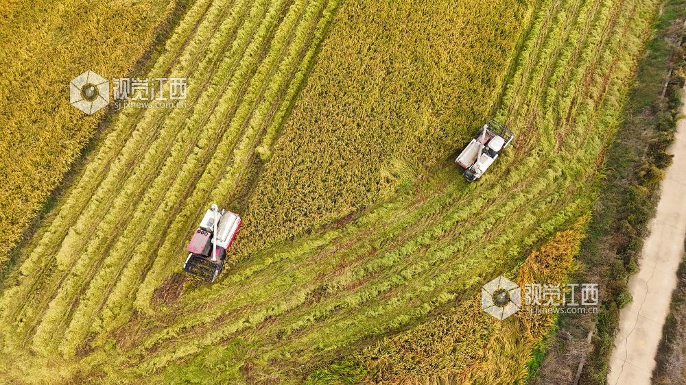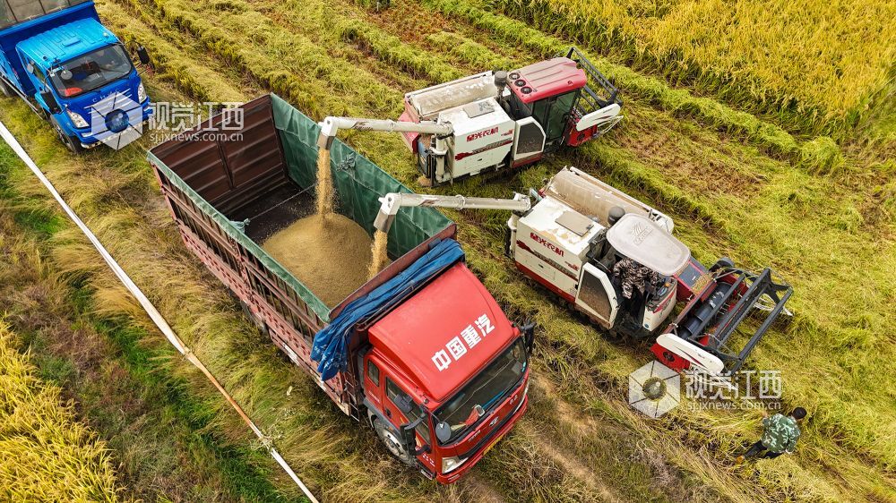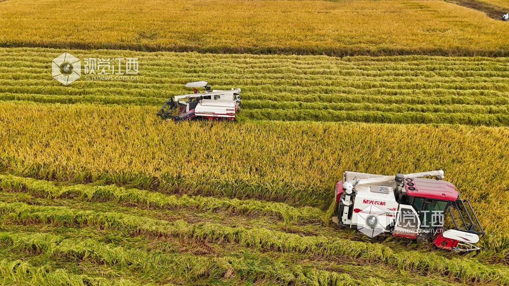 10月27日,江西省上饶市余干县九龙镇润溪村,村民驾驶农机收割晚稻。金秋时节,该县80余万亩晚稻进入收割季,村民抢抓晴好天气收割、晾晒晚稻。