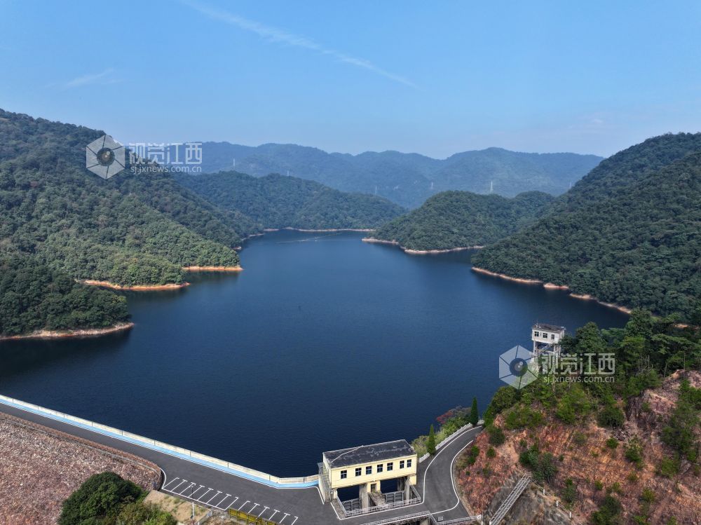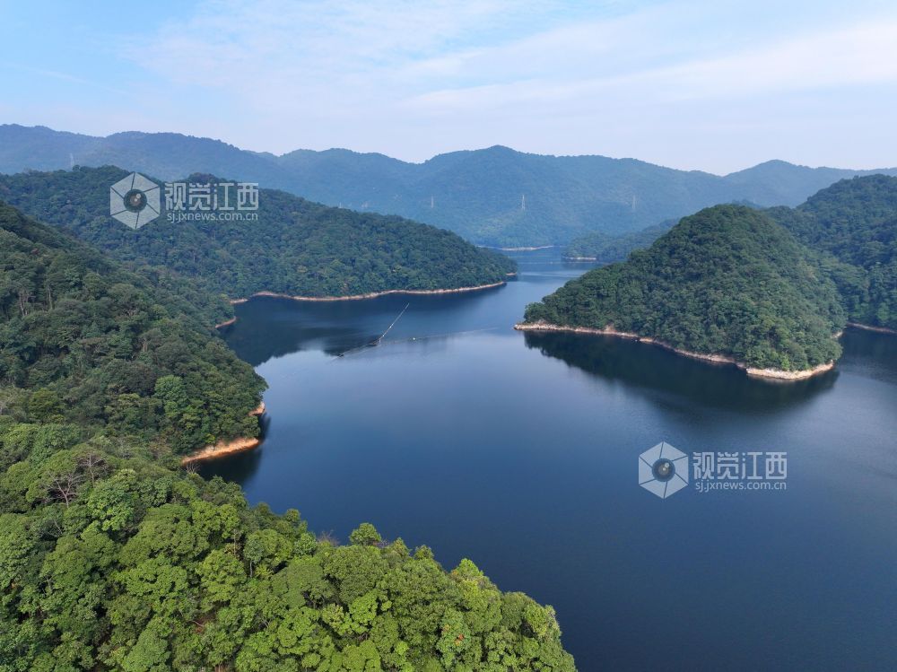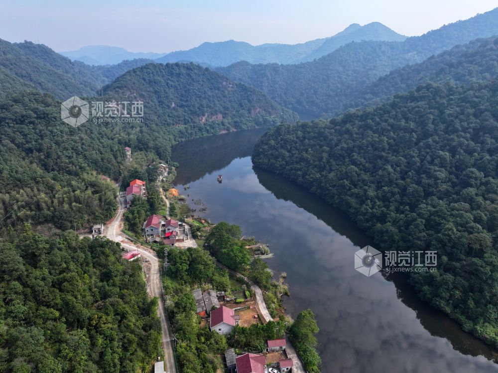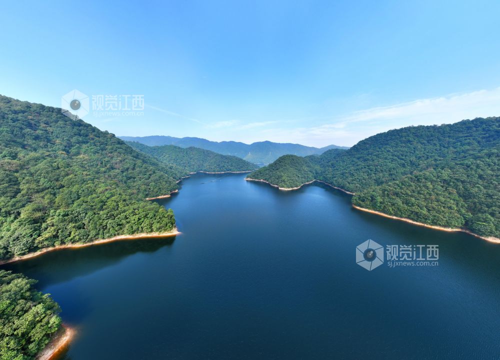 10月29日,江西省吉安市泰和县桥头镇白鹭湖国家森林公园一角,碧水与大山相映成景,壮美如画。