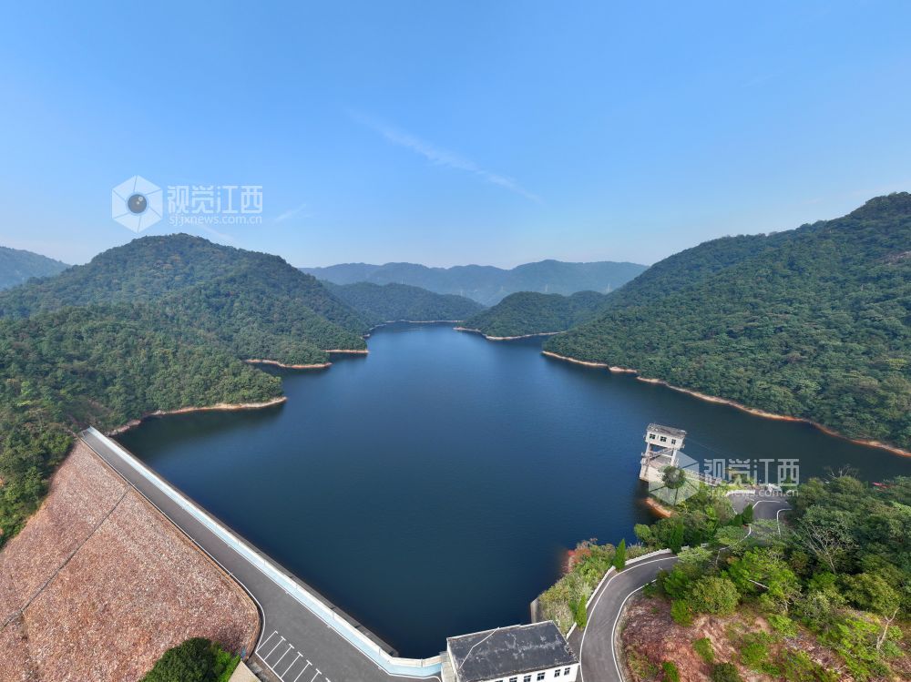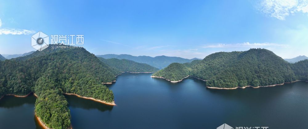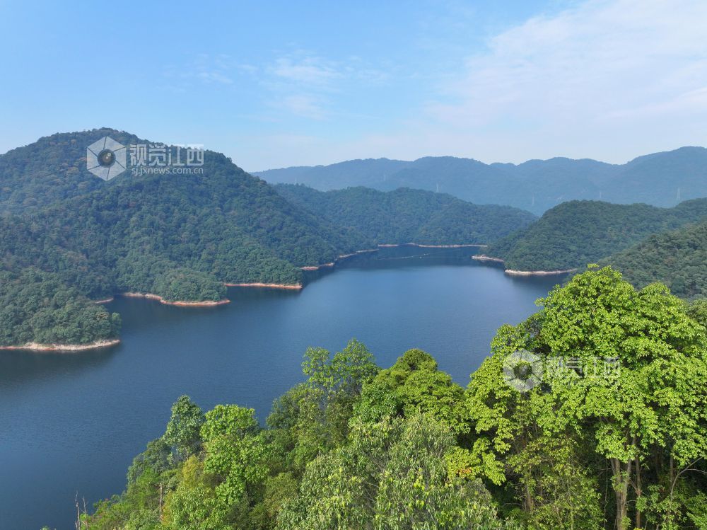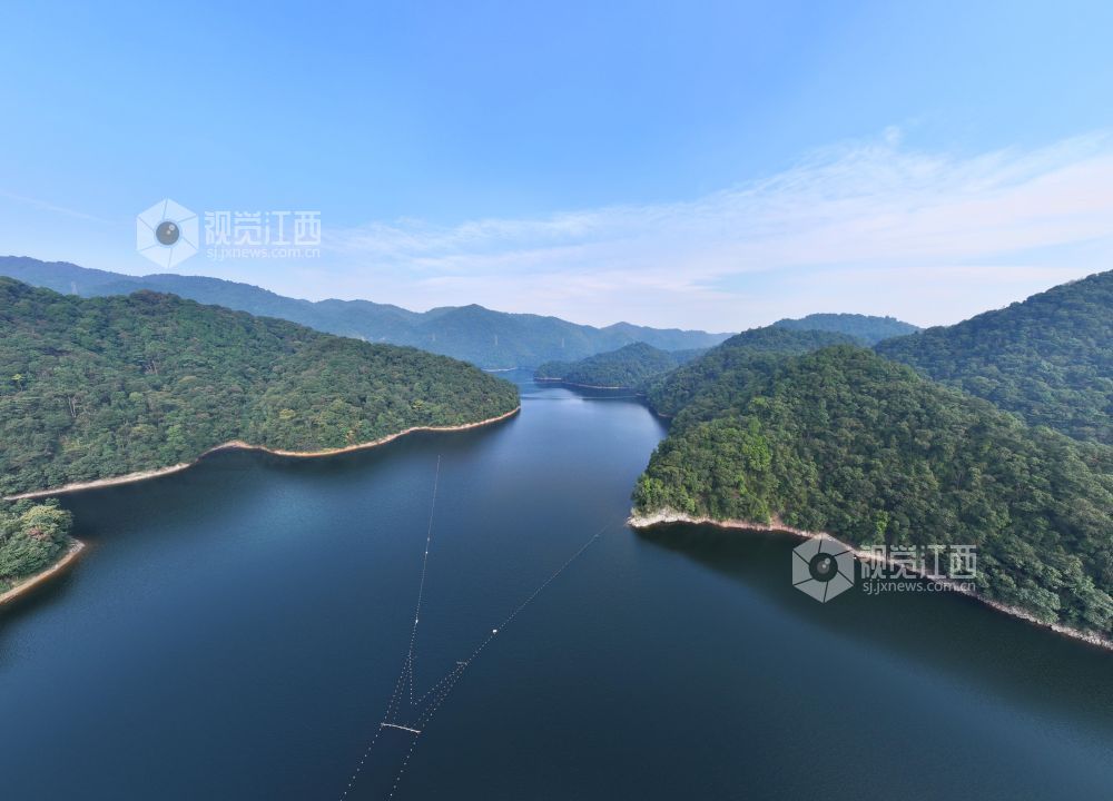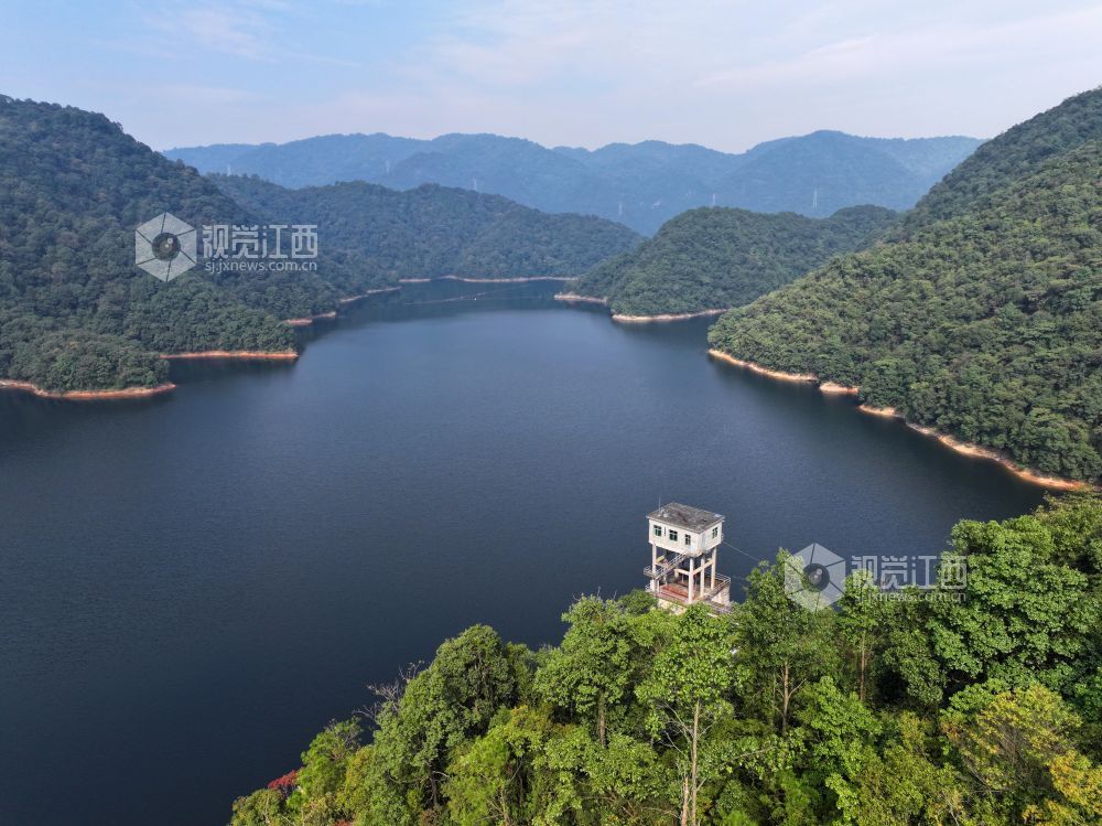 10月29日,江西省吉安市泰和县桥头镇白鹭湖国家森林公园一角,碧水与大山相映成景,壮美如画。
