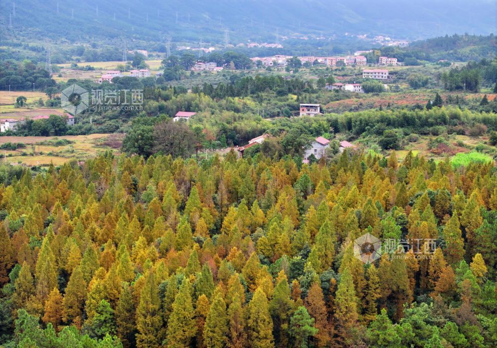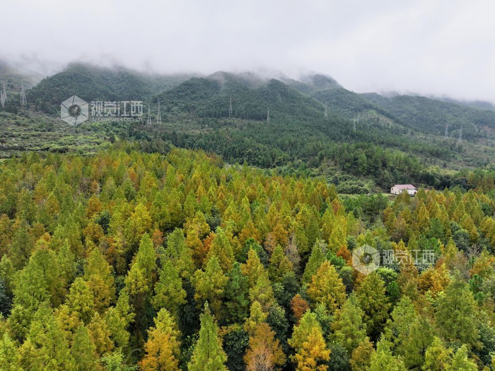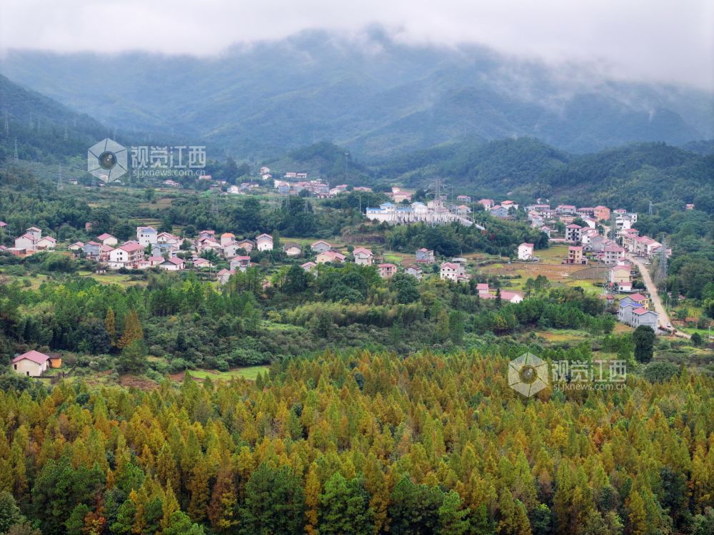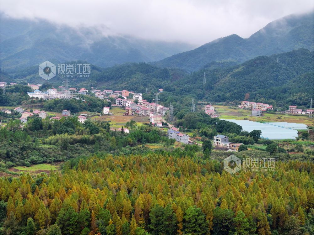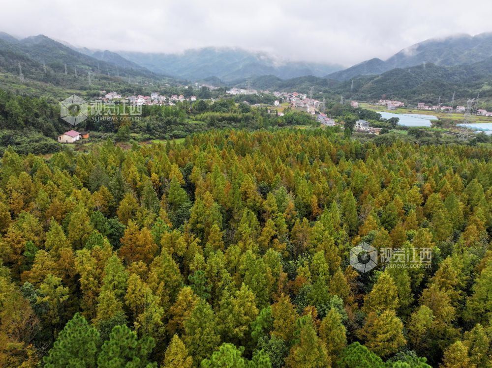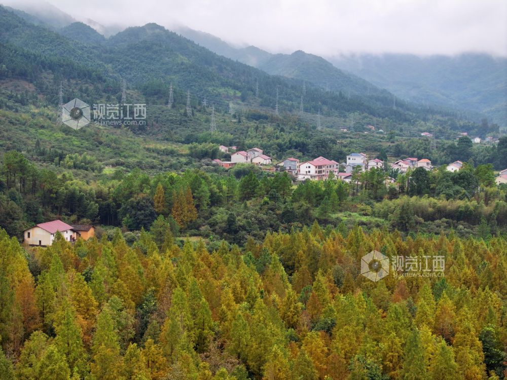 11月5日,江西省吉安市泰和县水槎乡新桥村,水杉泛黄,层林尽染,与村庄、大山相映成景,构成一幅初冬田园美丽画卷。