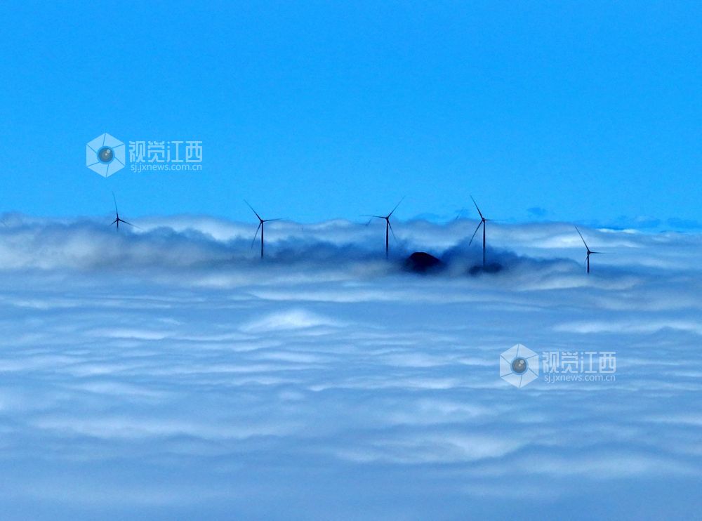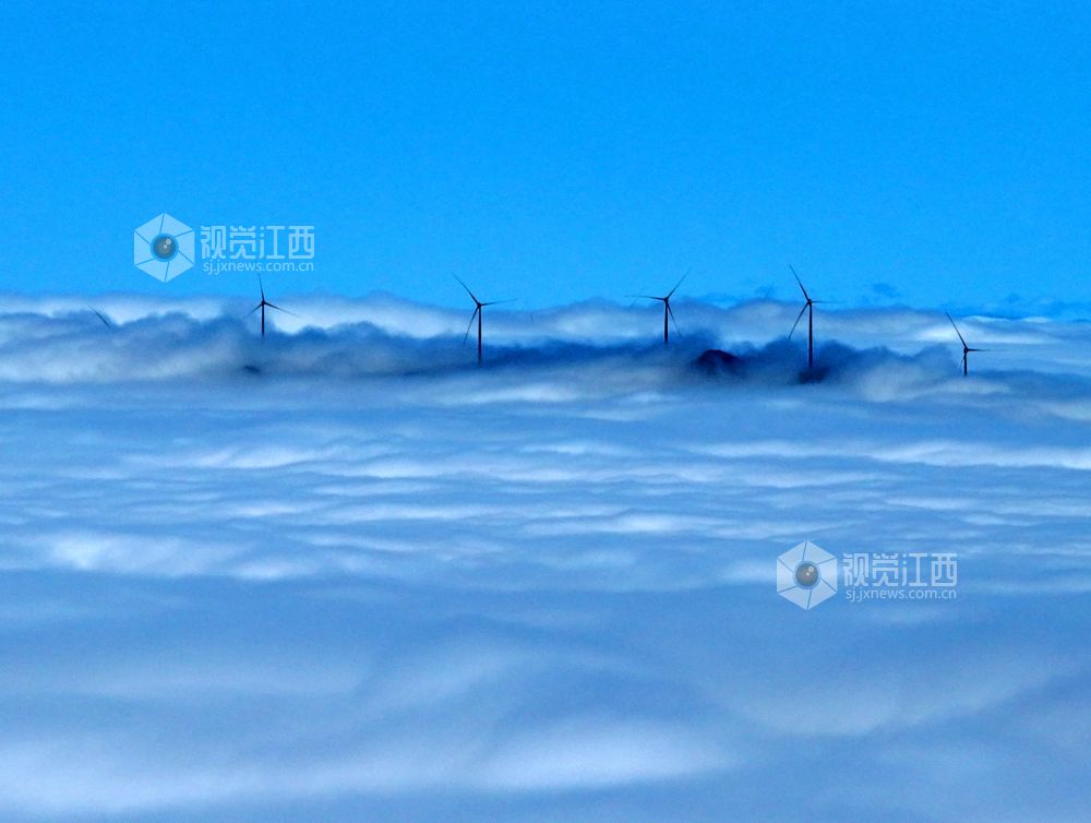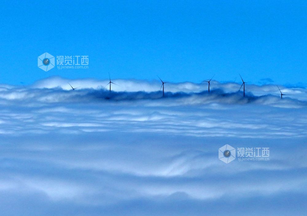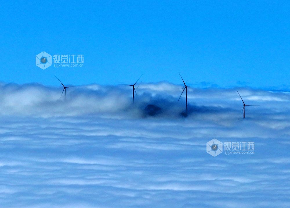 11月5日,江西省吉安市泰和县水槎乡天湖山上,云雾缭绕,风机若隐若现,构成一幅云端风景壮美画卷。