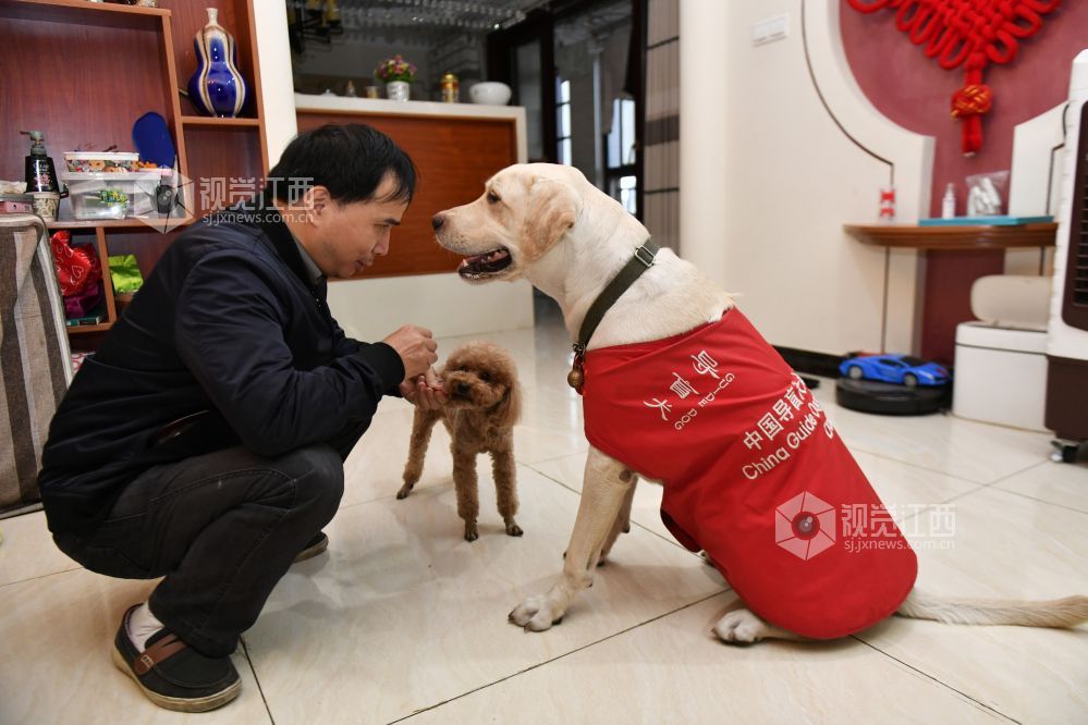 结束了一天工作的"史酷比"回到家中,这时候卸下导盲鞍的"史酷比"更像一只宠物犬,和主人开心的互动。对于陈智谋来说,"史酷比"跟他24小时相伴,除了带领主人避开障碍,安全护送主人到达目的地,导盲犬还是盲人的心灵伴侣,家庭成员。