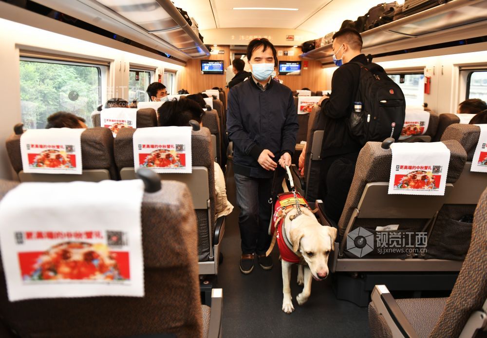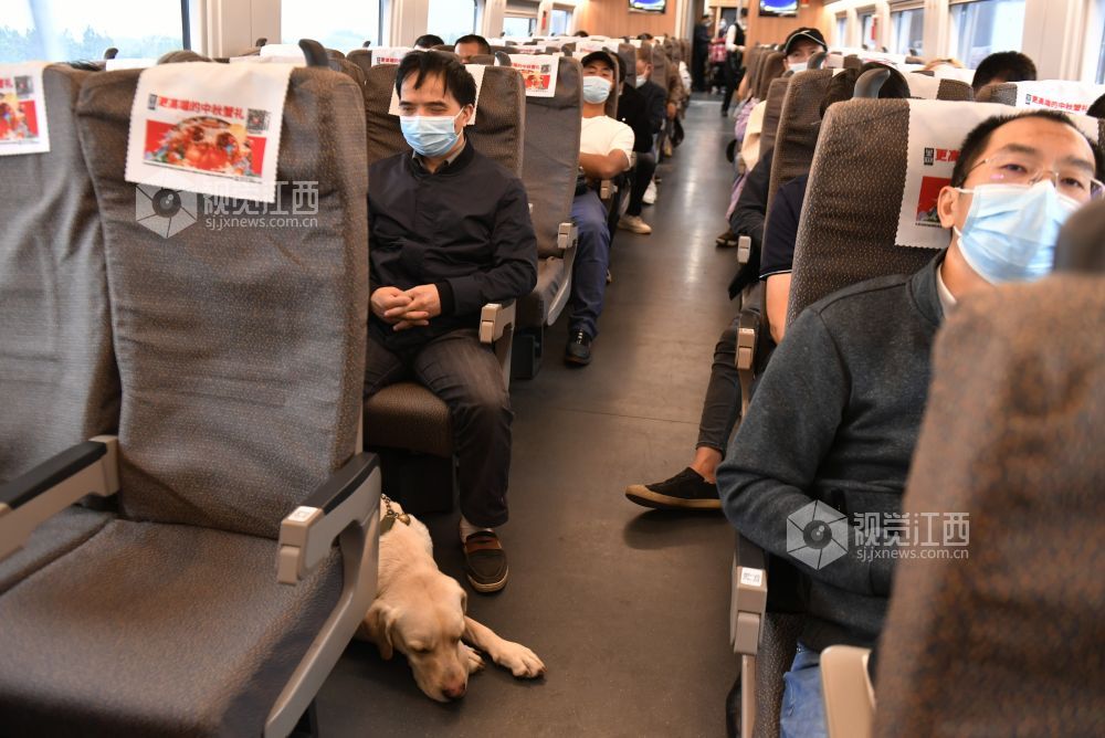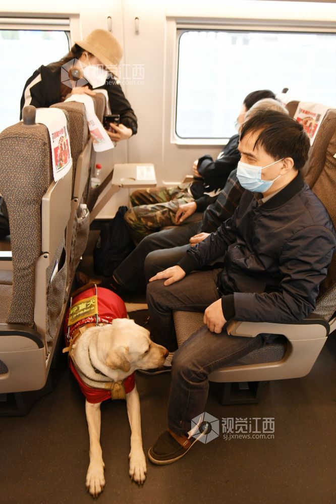 一只导盲犬出现在高铁车厢,引起了不少乘客的好奇。