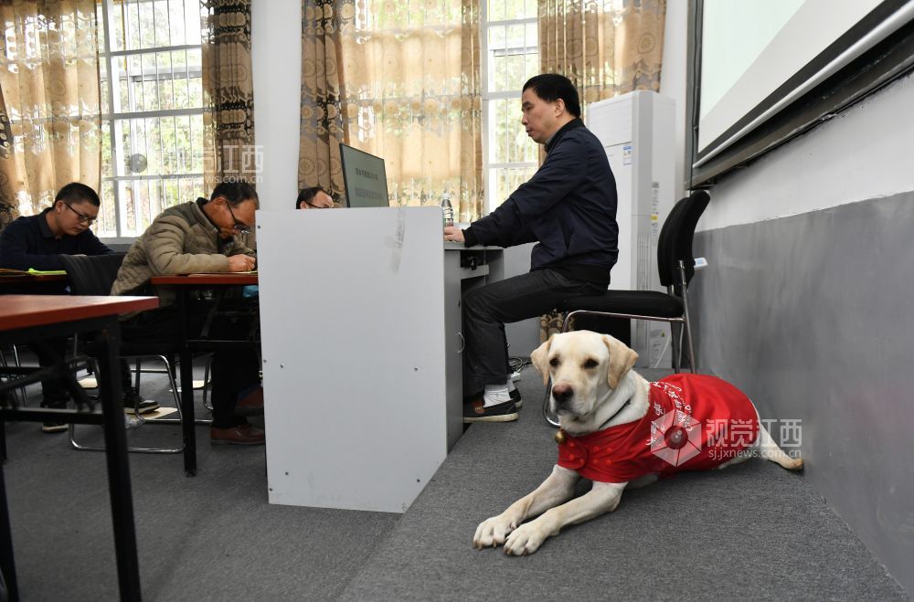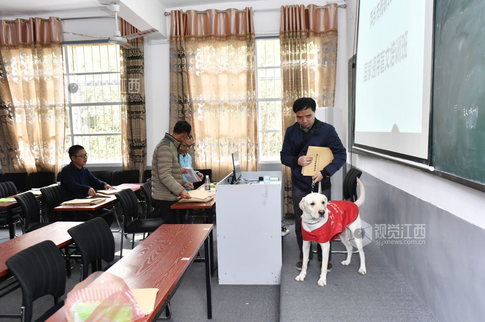 10月13日,江西萍乡残联的一个培训基地,江西省盲人协会副主席陈智谋正在给学员们进行国家通用盲文的培训,陈智谋的导盲犬"史酷比"则耐心的陪在他的身边。课程结束,陈智谋收拾随身物品起身,"史酷比"也马上进入工作状态, 指引主人走下讲台,走出教室。