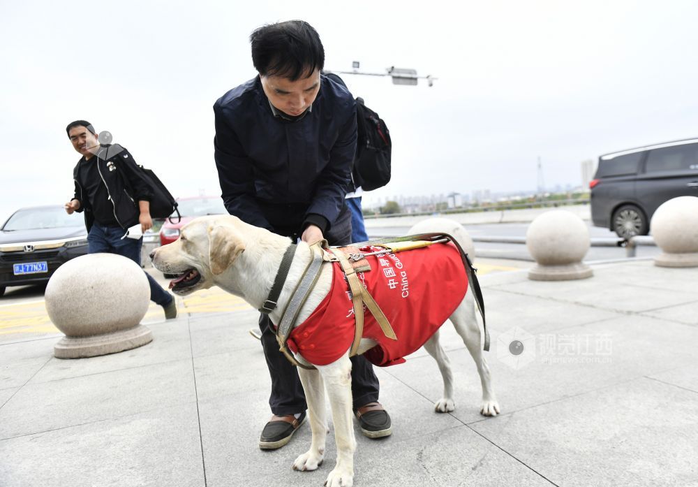 结束了在萍乡的课程,陈智谋准备返回南昌。出发前,他为"史酷比"装上导盲鞍,身上套着印有“导盲犬”字样的红色工作服和导盲鞍,它就知道自己进了工作状态。