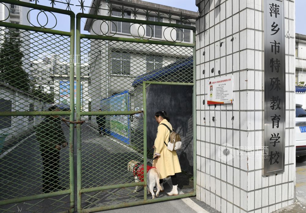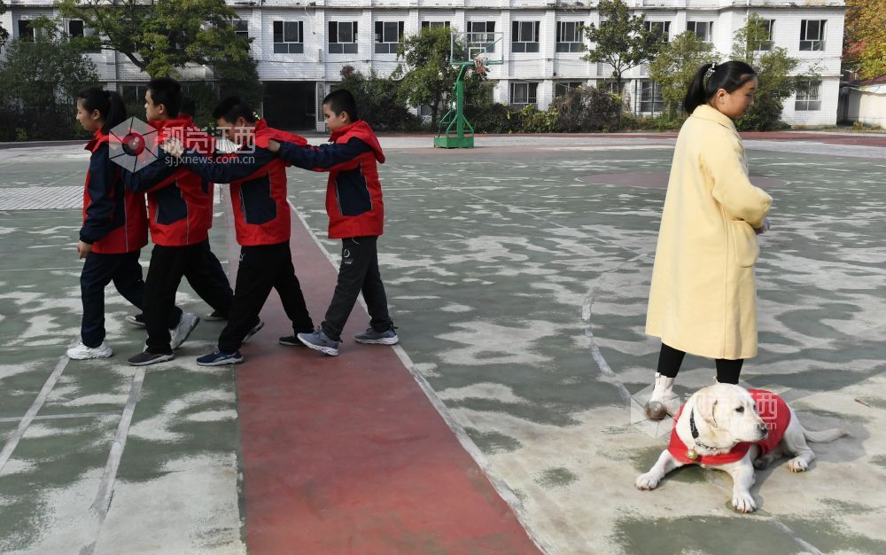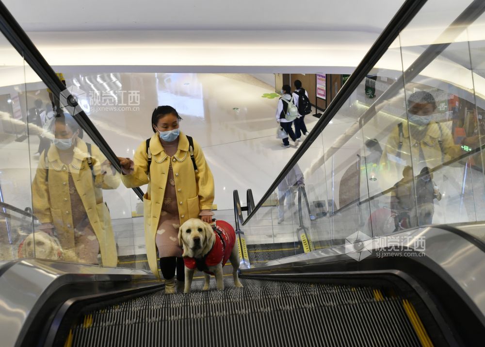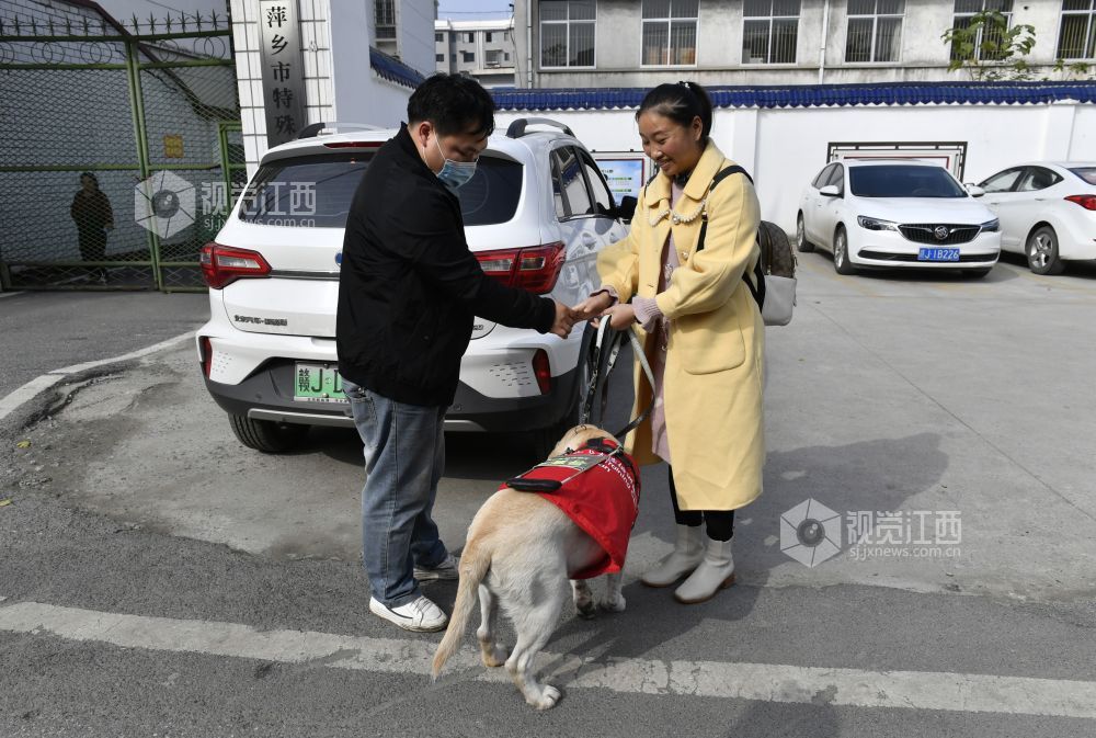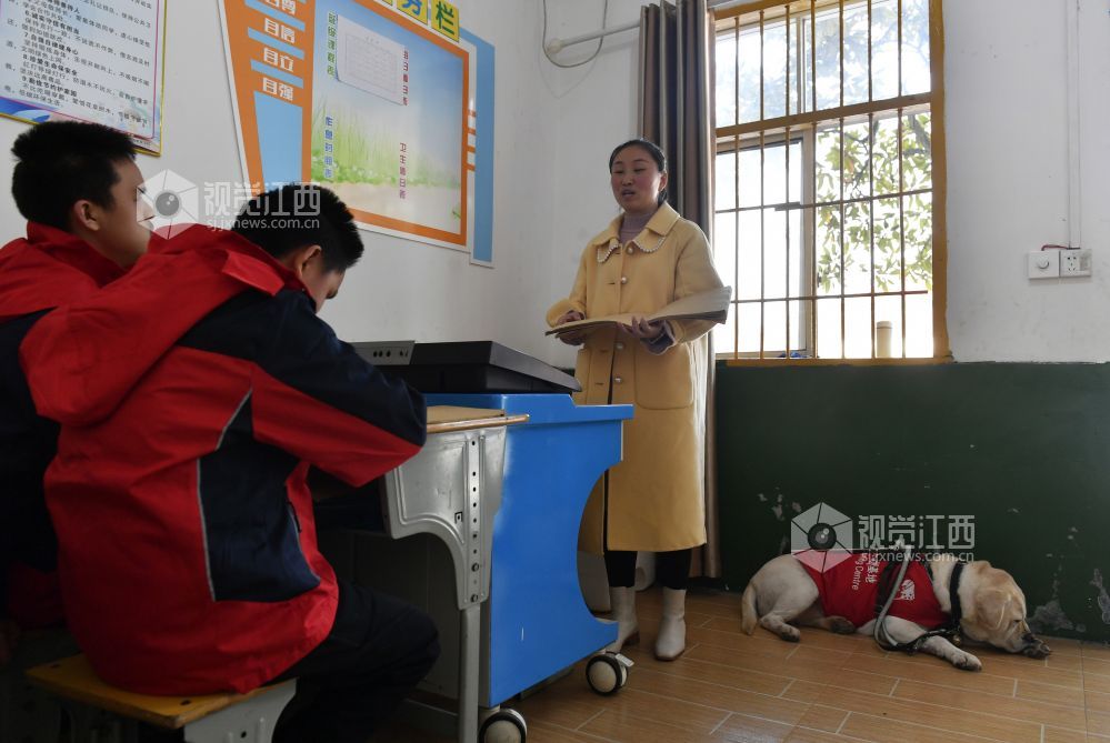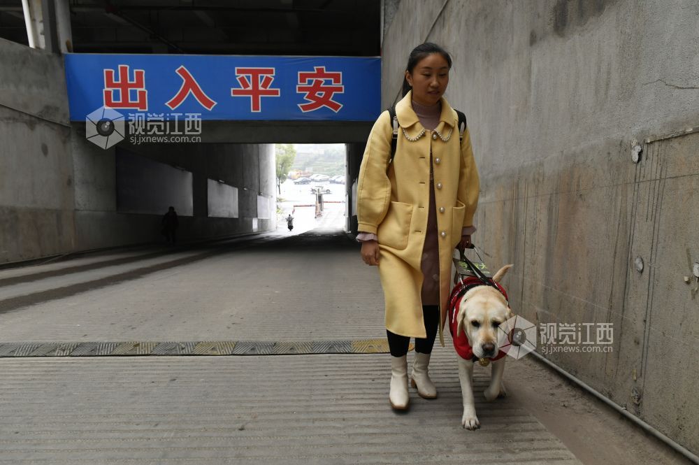 萍乡市特殊教育学校,导盲犬阿莎带领着婷仙上班。