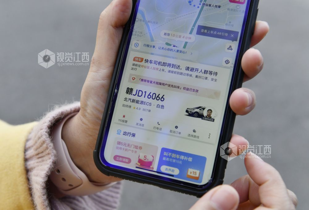 婷仙在网约车平台打车,平台会自动识别视障用户,在用户发出订单时,系统会向司机们发出提示——这是一名拥有导盲犬的视障用户。