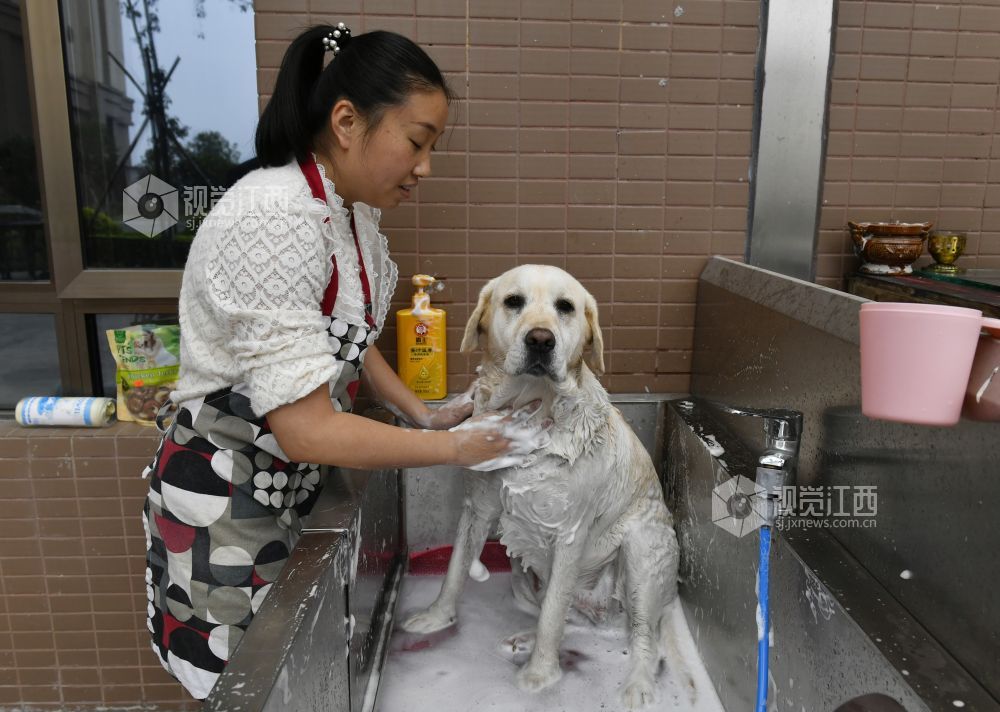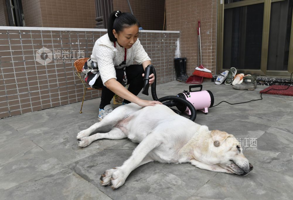 洗完澡,婷仙为爱莎吹毛。每天早上醒来,婷仙在为女儿梳洗过后,便要为爱莎梳理毛发;每天下班回家,婷仙第一件事便是为爱莎擦身体、洗爪爪。