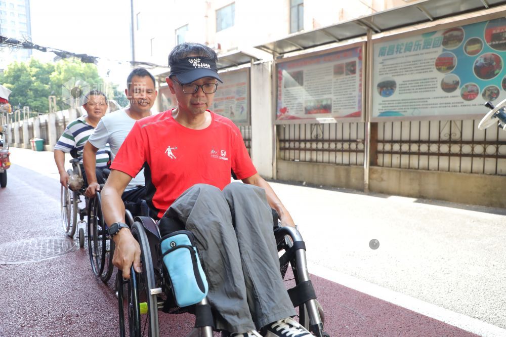 8月10日,谢俊武在南昌市康复之家的基地内和朋友们一起训练轮椅技巧。三十年前,谢俊武在实习期间,一次意外摔伤导致胸椎粉碎性骨折。从此,一个能跑能跳、酷爱篮球足球、能做各种滑旱冰高难度动作的活泼小伙子,变成了一个与轮椅为伴的脊髓损伤者。洗漱、吃饭、上厕所,这些以前可以轻松做到的事情,对于谢俊武都变得十分困难,最初的10年只能依靠家人照顾。为了生计,谢俊武修过家电、做过网吧的网管……“当时很绝望,就连伸手拿柜子上的东西都要帮助,觉得自己很没用”谢俊武说。