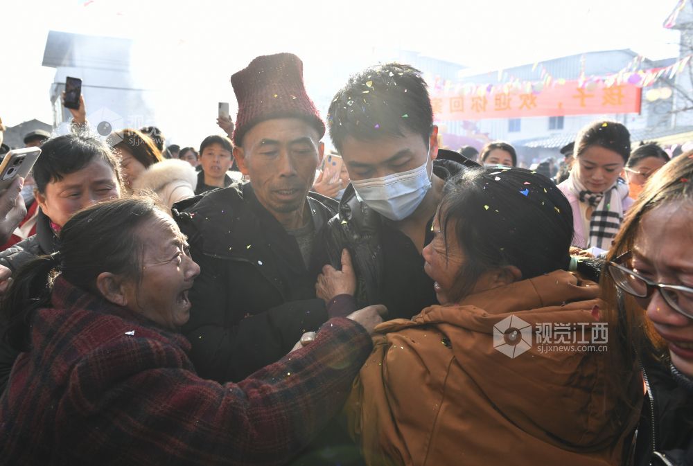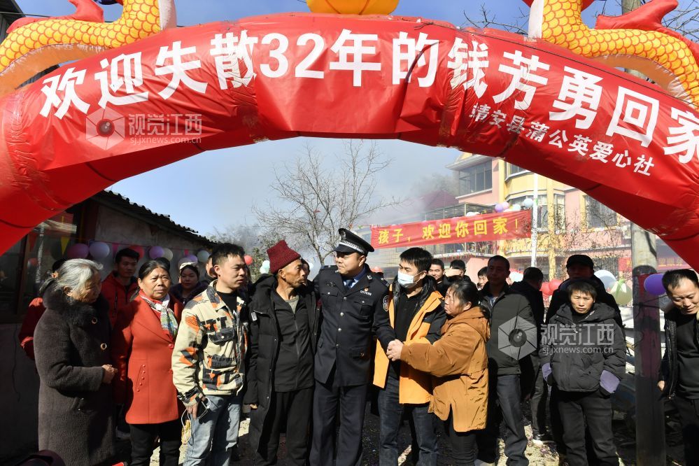 1月30日,江西省宜春市靖安县黄龙村(原瓦桥村)钱家组村,全村的村民守在乡村公路上翘首以待,警车内,钱芳勇不停的用手擦拭着眼泪。在余陈妹家里,“欢迎失散32年的钱芳勇回家”“倚门多年望眼穿,亲人归来家才暖”“孩子,欢迎你回家!”的横幅挂起,全家人都在等着他回来。